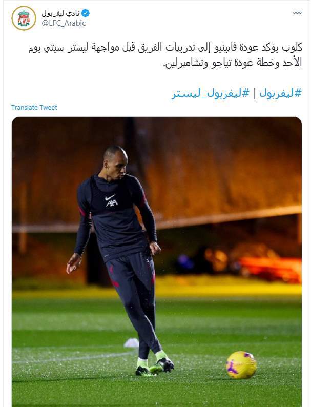 وكتب نادي ليفربول تغريدة على تويتر: "كلوب يؤكد عودة فابينيو إلى تدريبات الفريق قبل مواجهة ليستر سيتي يوم الأحد وخطة لإعادة تياجو وتشامبرلين.. #ليفربول | #ليفربول_ليستر"