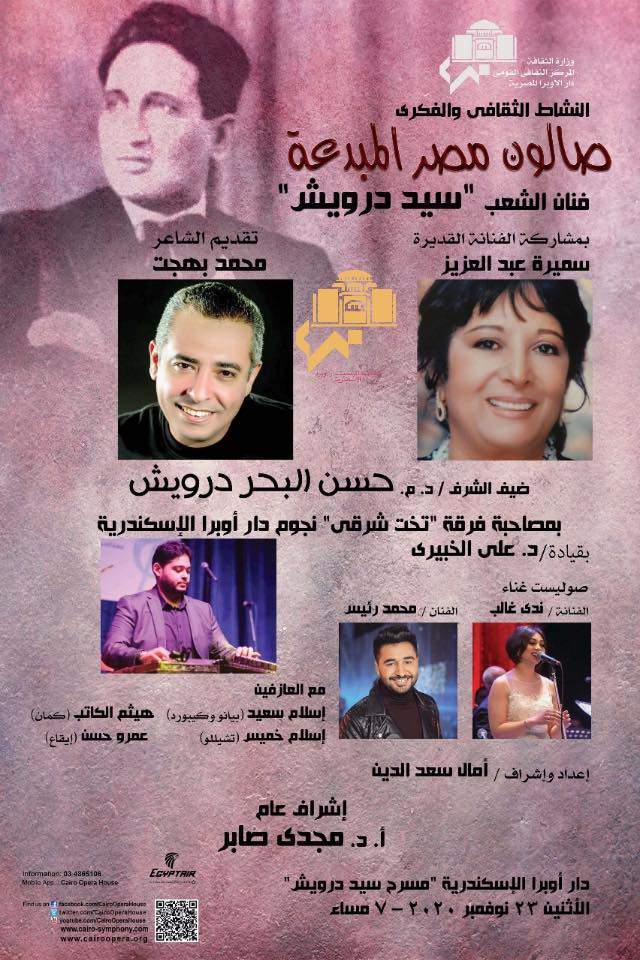 يشارك بالحفل حفيد الفنان "سيد درويش" الدكتور حسن البحر درويش، وتأتي الأمسية احتفاءً وتقديرا بأبن الاسكندرية فنان الشعب وخادم الموسيقى، يتضمن برنامج الأمسية باقة متميزة من أروع أعماله التى اثرى بها المجتمع المصرى والعربى.