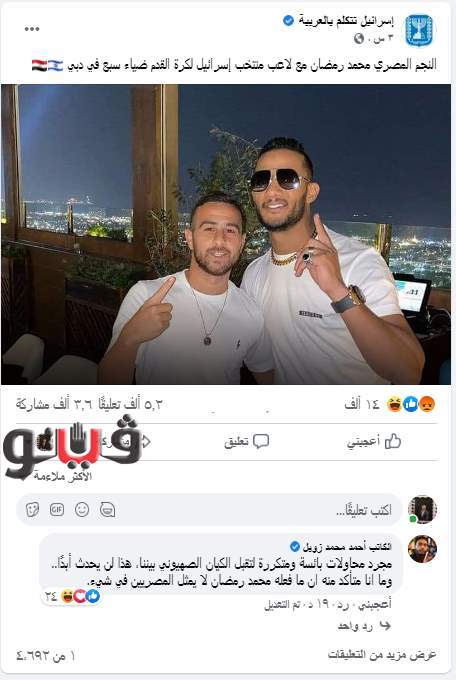 نشرت الصفحة الرسمية لـ«إسرائيل تتكلم بالعربية» على موقع التواصل الاجتماعي «فيس بوك» صورة تجمع بين لاعب المنتخب الإسرائيلي لكرة القدم ضياء سبع مع الفنان محمد رمضان، وذلك خلال تواجدهما في دبي.