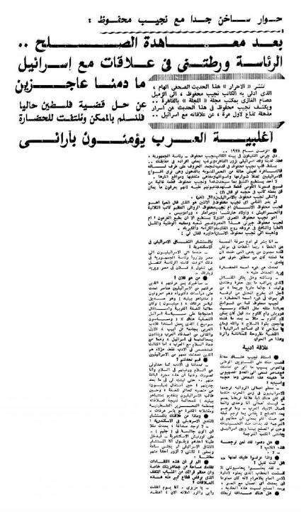وأضاف "محفوظ" في حواره مع المجلة عن الشخصيات الإسرائيلية التي كان يعرفها قائلا: "كانت جميعها شخصيات عملت عنه أبحاثا ودراسات دكتوراه منهم متتياهو بلد، وهو صديق ياسر عرفات، وميلبسون وهو حاكم الضفة الغربية الذي استقال احتجاجًا على سياسة إسرائيل بالإضافة لساسون سوميخ أستاذ الأدب العربي بجامعة تل أبيب".