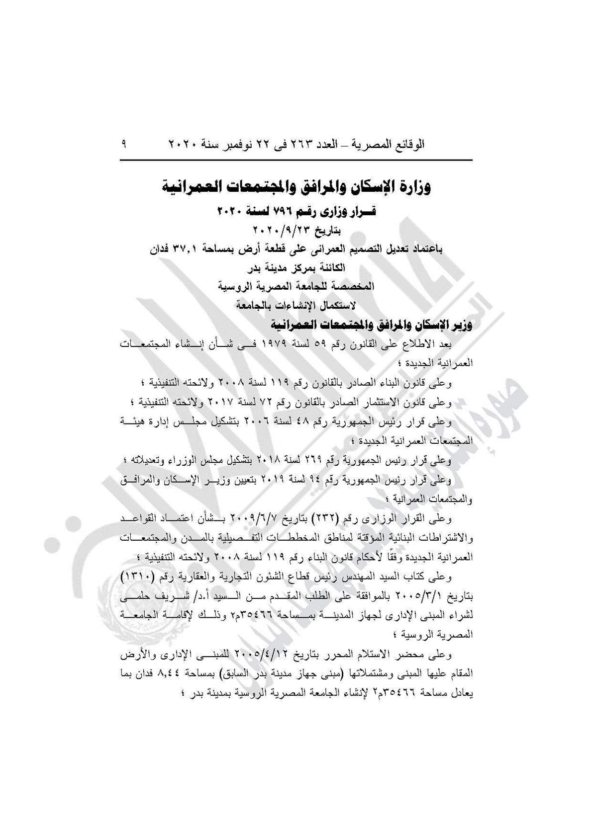 نشرت جريدة الوقائع المصرية في عددها رقم 263، الصادر في 22 نوفمبر 2020، قرار وزارة الإسكان والمرافق والمجتمعات العمرانية رقم 796 لسنة 2020، بشأن اعتماد تعديل التصميم العمرانى لاستكمال الإنشاءات بالجامعة المصرية الروسية بمركز مدينة بدر.