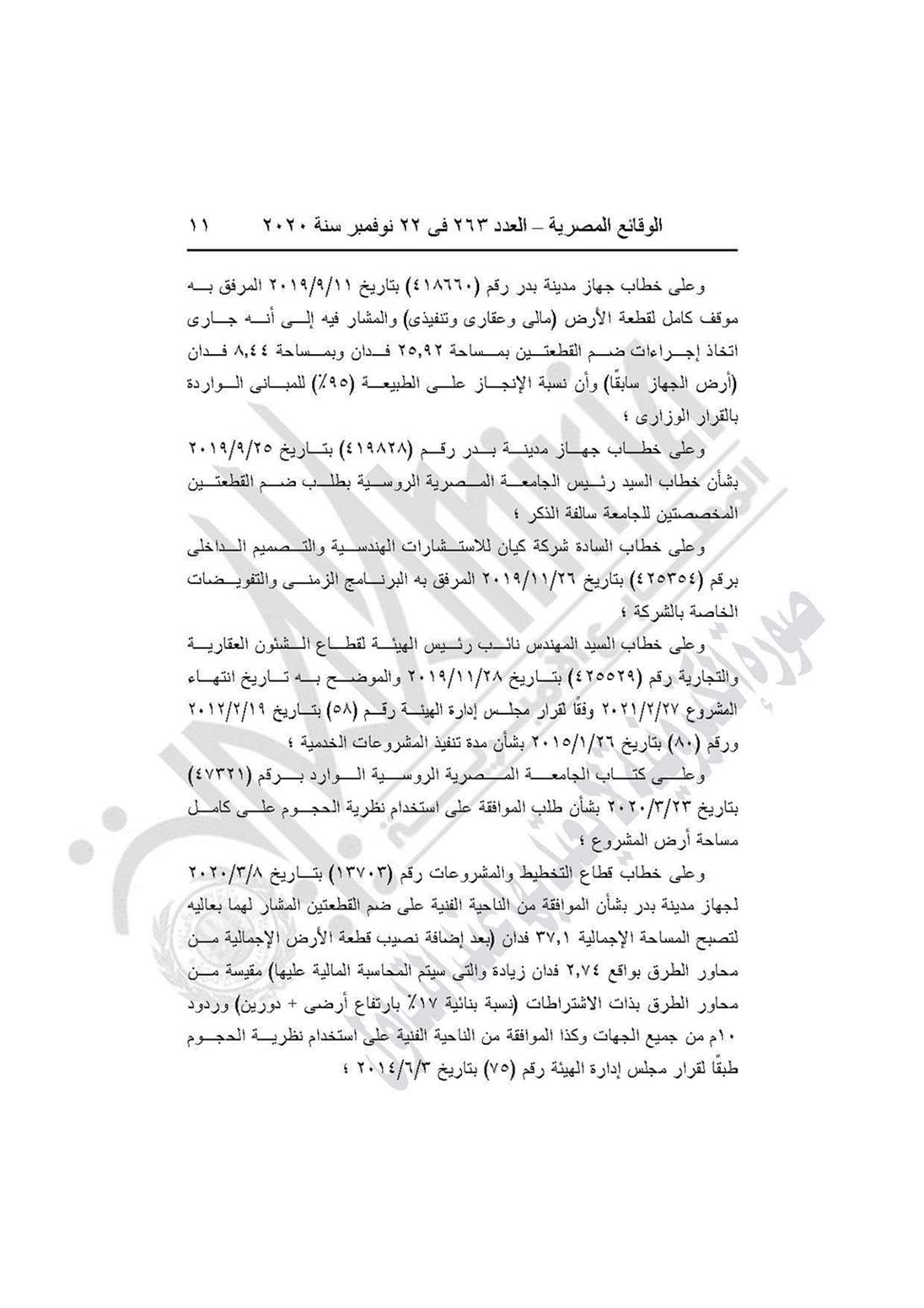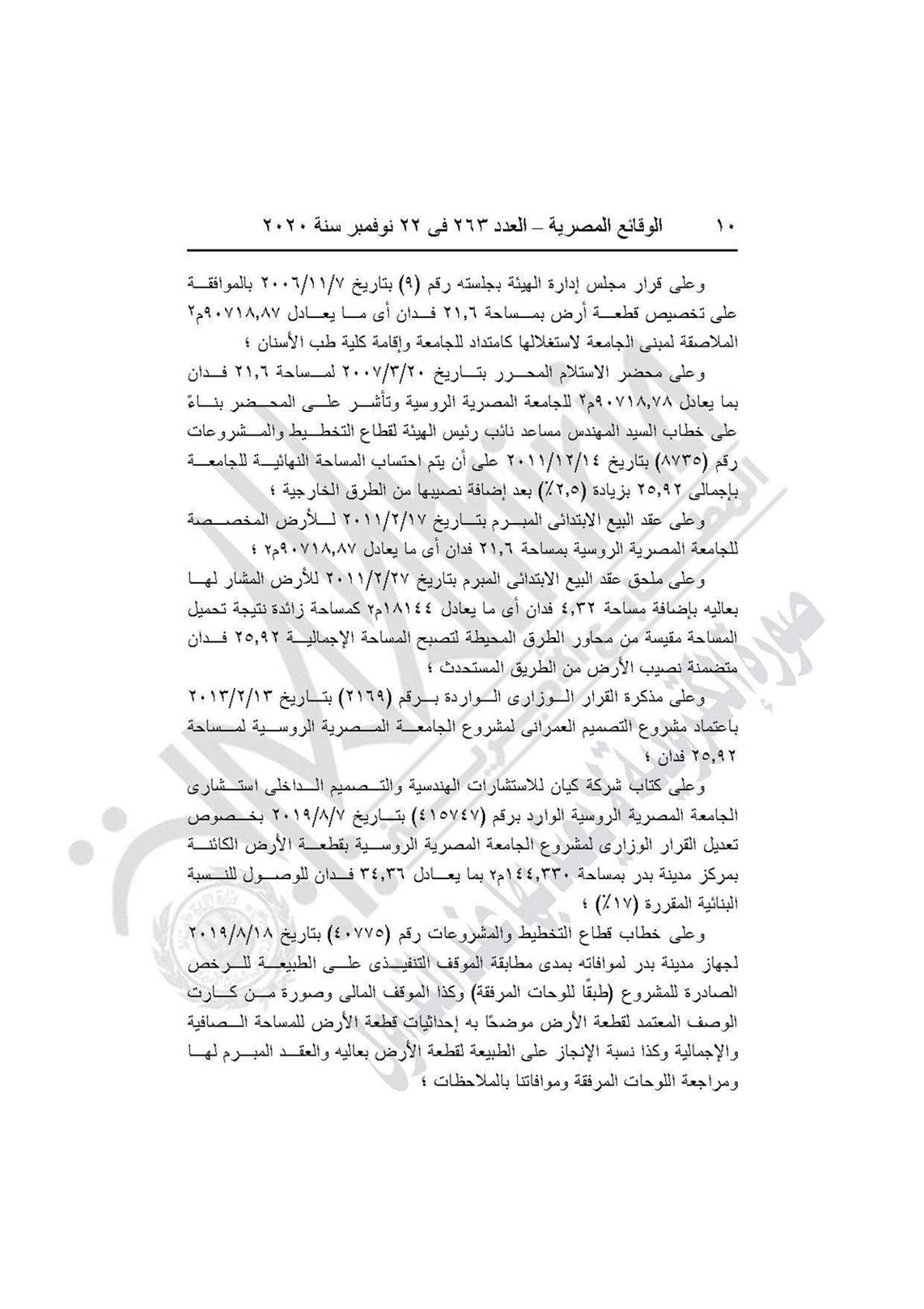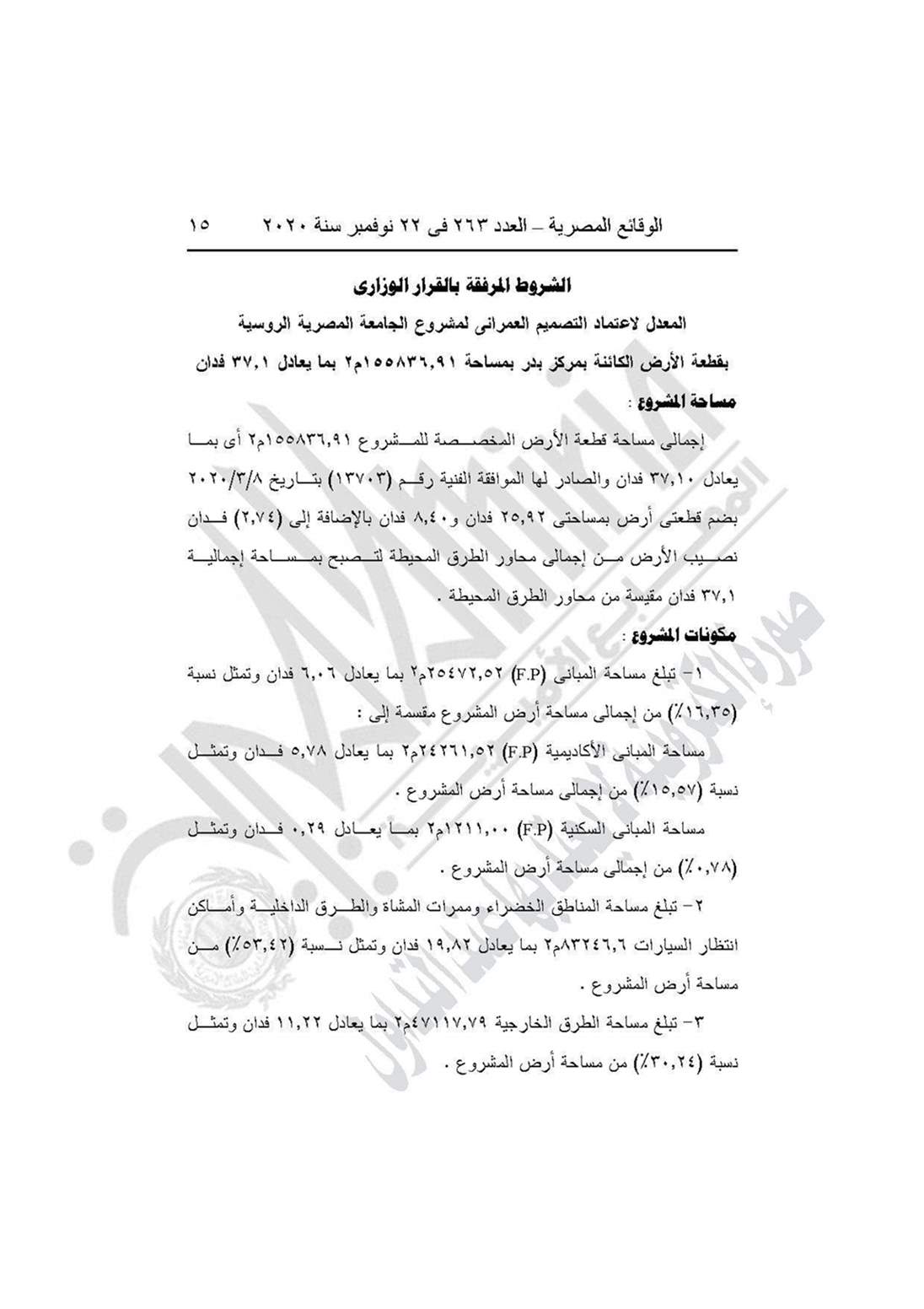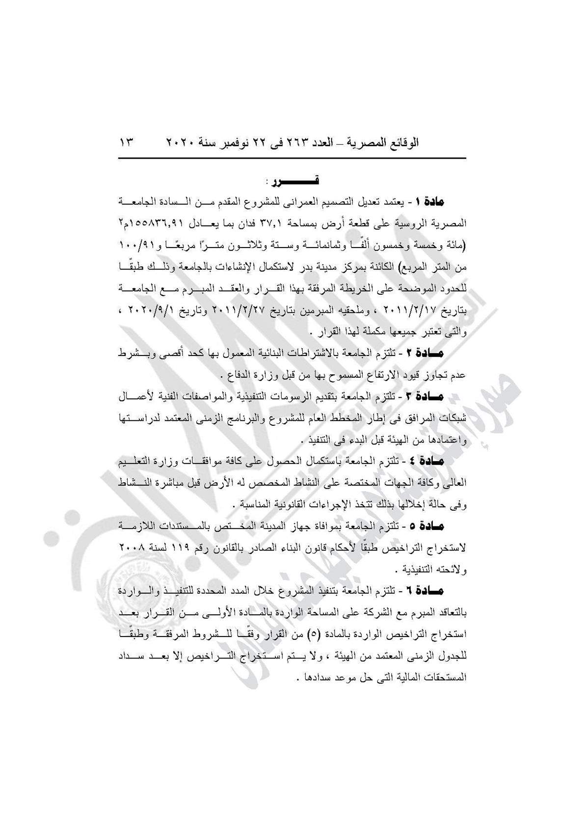 وينص القرار على اعتماد تعديل التصميم العمرانى على قطعة أرض بمساحة 37.1 فدان الكائنة بمركز مدينة بدر المخصصة للجامعة المصرية الروسية لاستكمال الإنشاءات بالجامعة.
