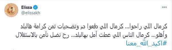 وكتبت إليسا تغريدة على تويتر " كرمال اللي راحوا... كرمال اللي دفعوا دم وتضحيات تمن كرامة هالبلد وأهلو... كرمال الناس اللي عطت أمل بهالبلد... رح نضل نآمن بالاستقلال #اكيد_الله_معنا"