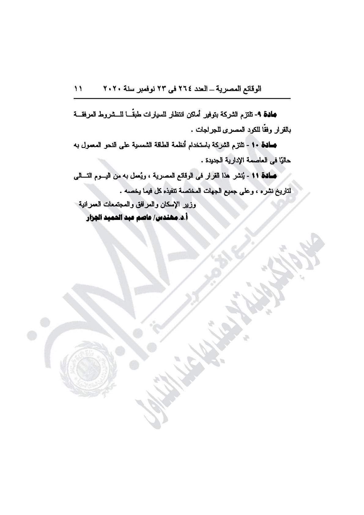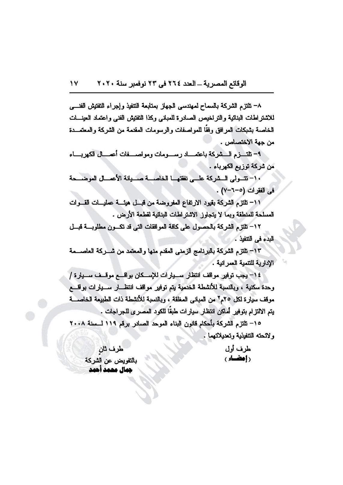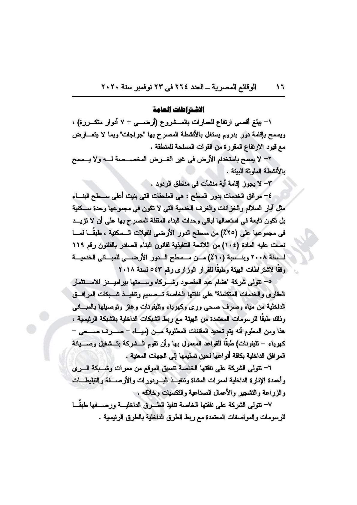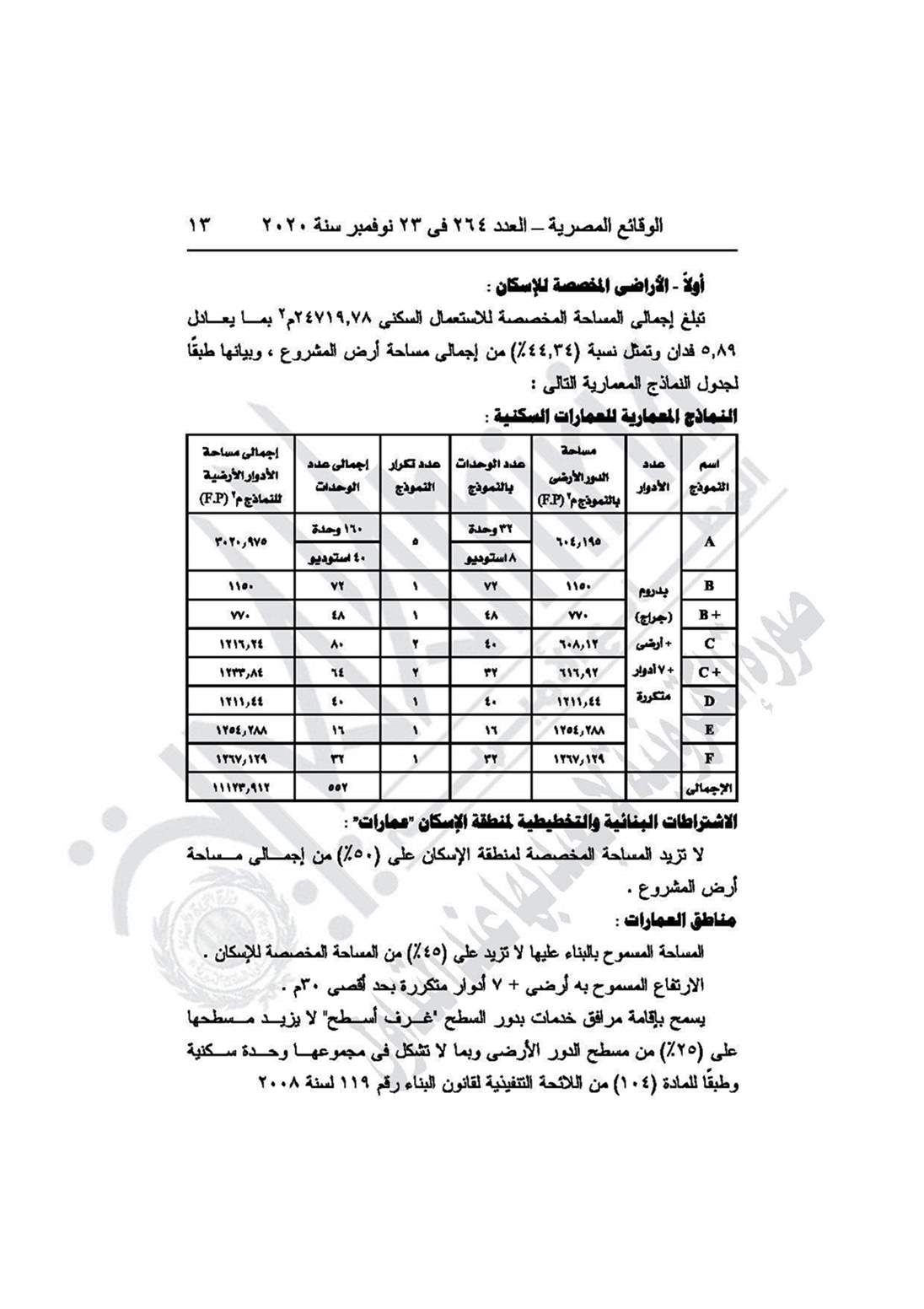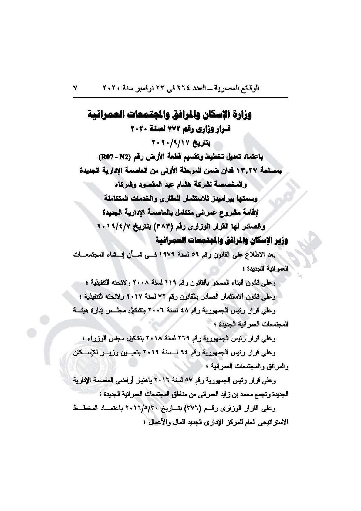 نشرت جريدة الوقائع المصرية في عددها رقم 264، الصادر في 23 نوفمبر 2020، قرار وزارة الإسكان والمرافق والمجتمعات العمرانية رقم 772 لسنة 2020، اعتماد تعديل تخطيط وتقسيم قطعة أرض بمساحة 13.27 فدان ضمن المرحلة الأولى من العاصمة الإدارية الجديدة لإقامة مشروعا عمرانيا متكاملا بالعاصمة الإدارية الجديدة.
