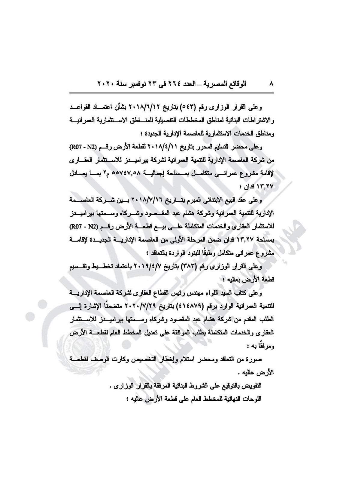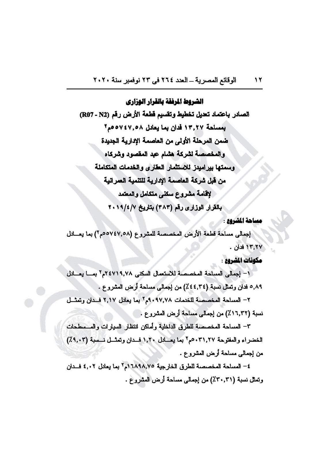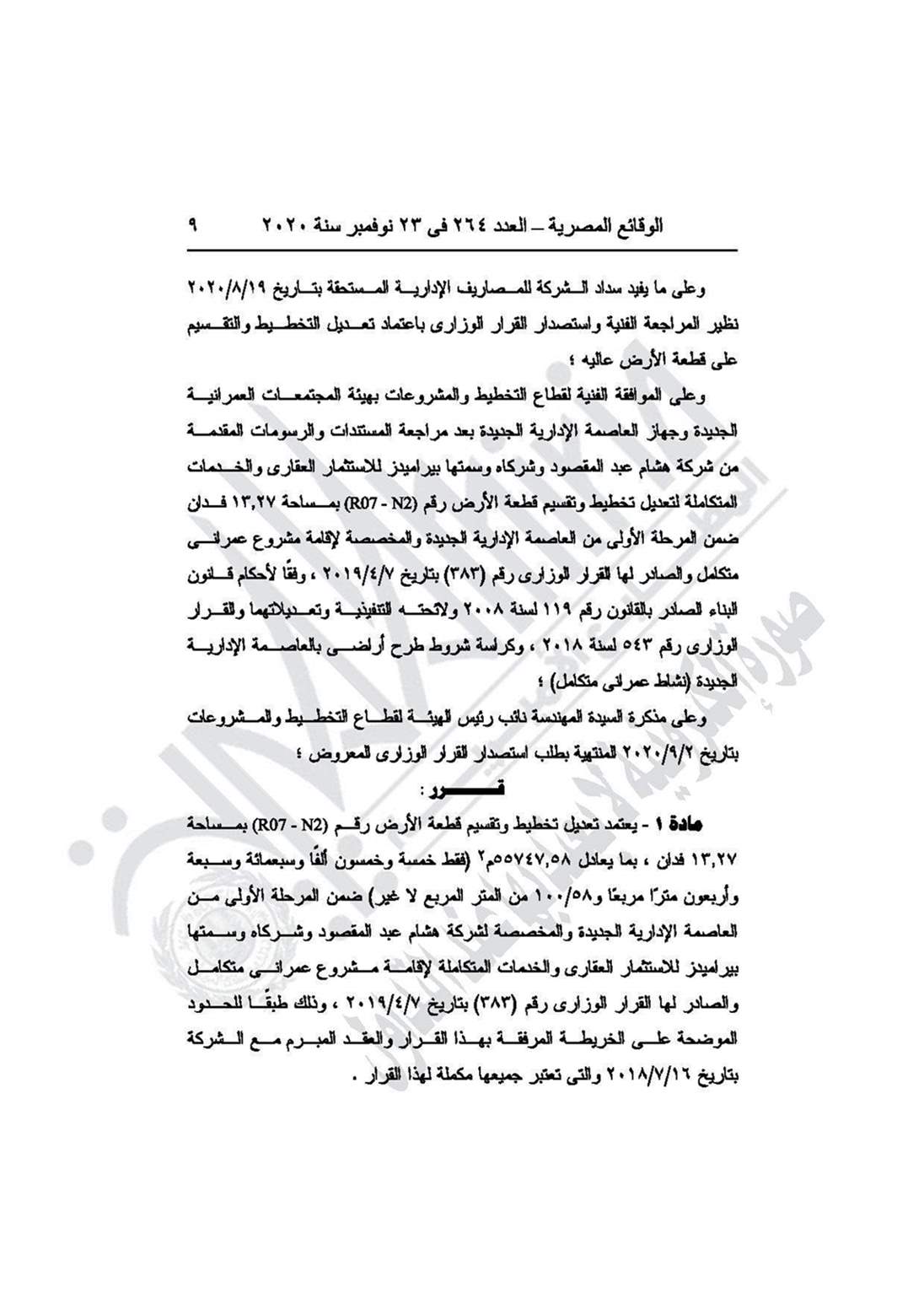 وينص القرار على اعتماد تعديل تخطيط وتقسيم قطعة الأرض رقم (R07- N2) بمساحة 13.27 فدان ضمن المرحلة الأولى من العاصمة الإدارية الجديدة والمخصصة لشركة هشام عبد المقصود وشركاه وسمتها بيراميدز للاستثمار العقاري والخدمات المتكاملة، لإقامة مشروع عمراني متكامل بالعصامة الإدارية الجديدة.