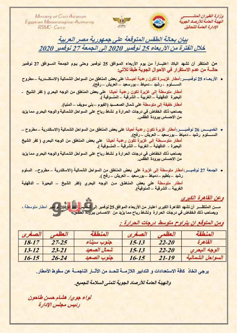 أمطار متوسطة إلى غزيرة قد تكون رعدية على بعض السواحل الشمالية بمناطق " الإسكندرية ، مطروح ، رشيد ، بلطيم ، دمياط ،رفح ،العريش ، السلوم"، وأمطار متوسطة على شمال الوجه البحري بـ"كفر الشيخ ، البحيرة ، الدقهلية".