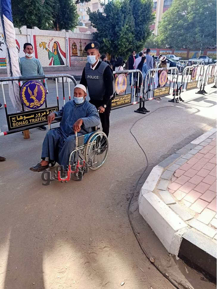 ورصدت "فيتو " صورا لمساعدة أحد أفراد الشرطة لكبار السن داخل اللجنة الانتخابية رقم 25 , 26 الثانوية بنات بسوهاج كما قاموا بتوفير الكراسي المتحركة للجان لمساعدة كبار السن والمرضى من المواطنين.