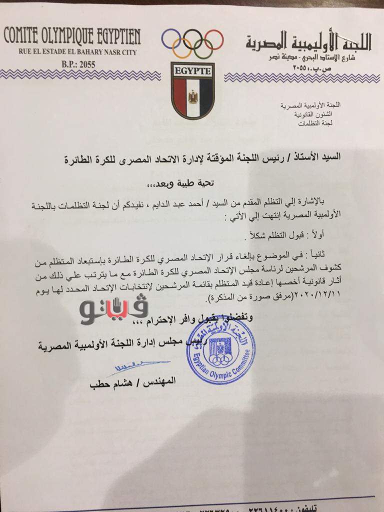 وألزمت اللجنة الأولمبية اتحاد الكرة الطائرة بإعادة أحمد عبد الدايم لكشوف المرشحين في الانتخابات المقرر إقامتها يوم 11 ديسمبر المقبل.