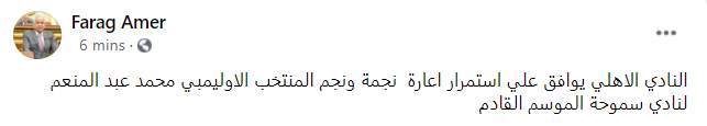 وأكد فرج عامر عبر حسابه الشخصي على موقع التواصل الإجتماعي "فيسبوك"، استمرار عبد المنعم بصفوف سموحة موسم آخر بعد موافقة الأهلي رسميا على تمديد إعارة اللاعب.
