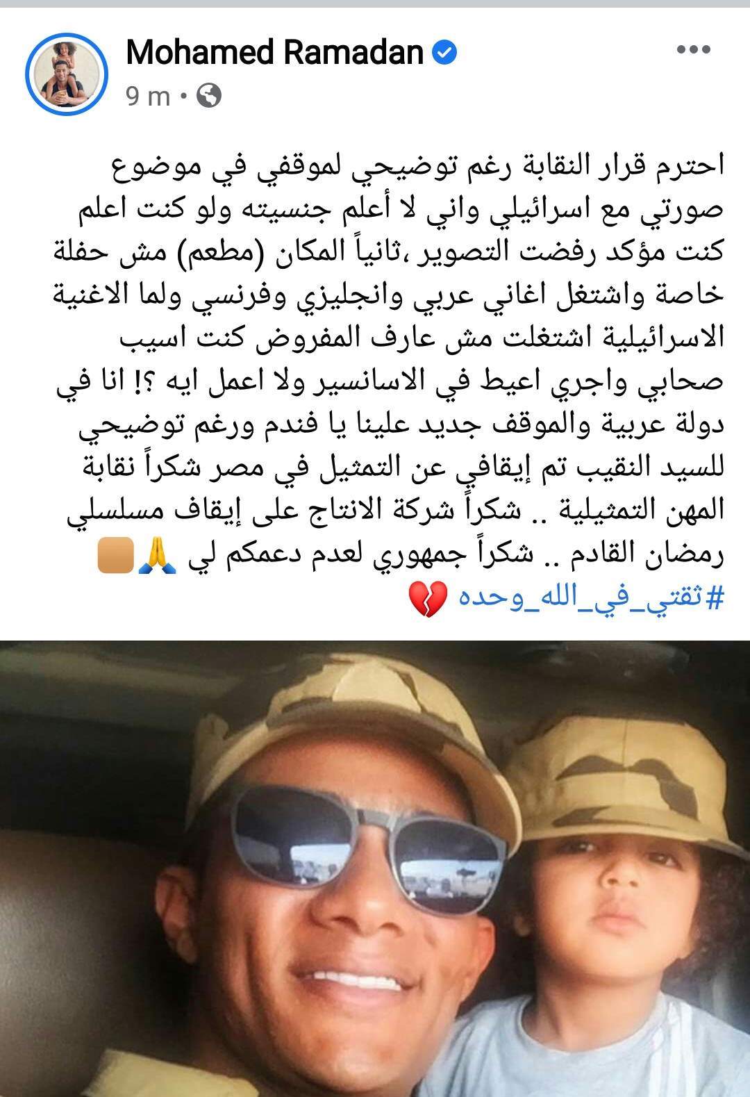 علق الفنان محمد رمضان عبر حسابه الشخصي على موقع التواصل الاجتماعي "فيس بوك"، على قرار مجلس نقابة المهن التمثيلية بوقفه عن العمل وتحويله للتحقيق على خلفية ظهوره مع مشاهير إسرائيليين في مدينة دبي الإماراتية.