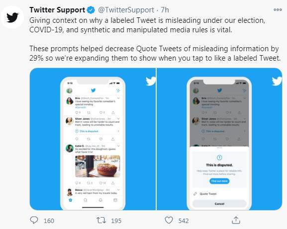 وأوضحت تويتر في منشور عبر حساب "دعم تويتر" أن تلك التقنية الجديدة ستوجه تحذيرا لأي مستخدم يقوم بالإعجاب بتغريدة أو منشور متنازع عليها أو تم تصنيفها على أنها قد تحتوي معلومات مضللة.