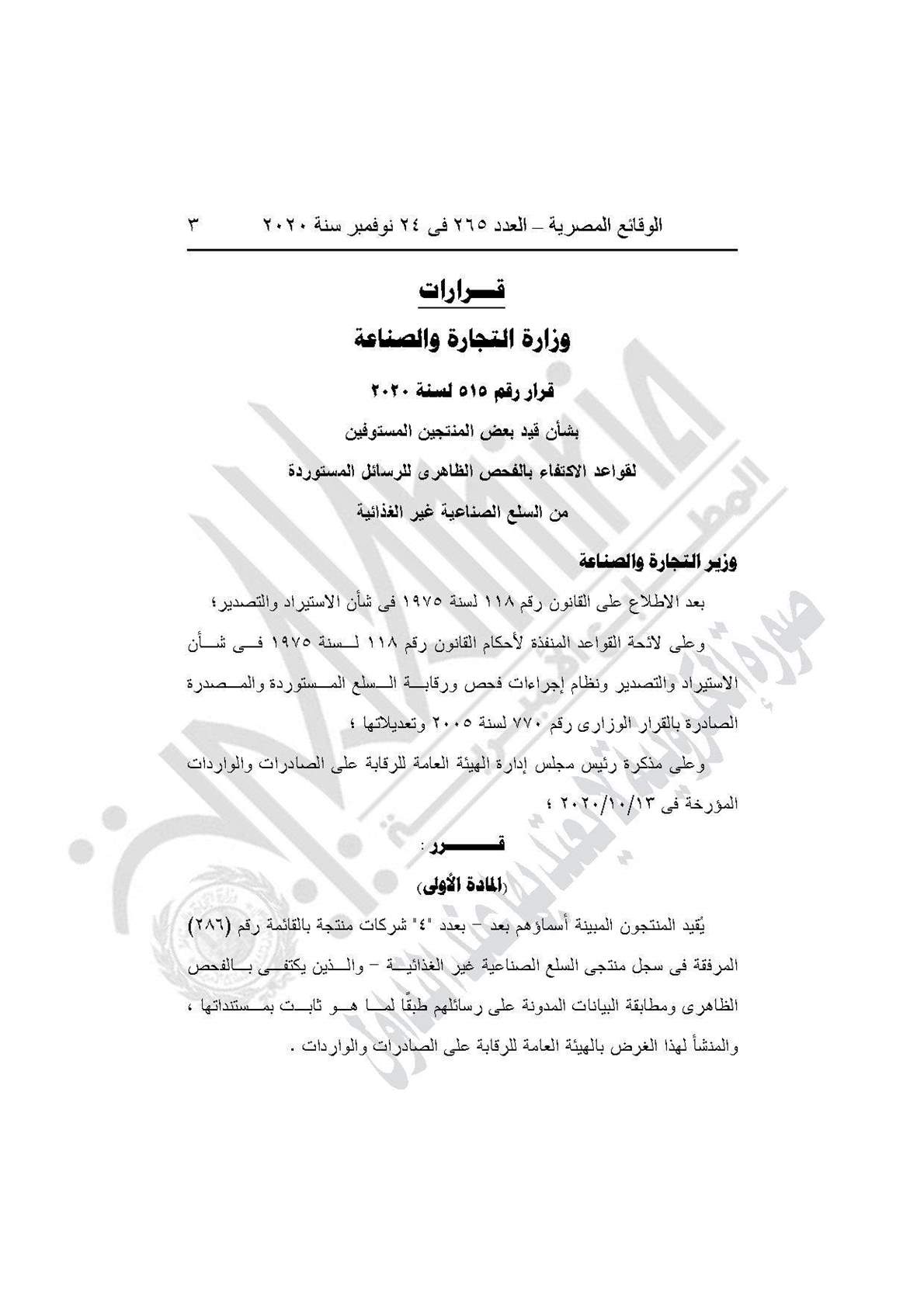 القرار رقم 515 لسنة 2020، بشأن قيد بعض المنتجين المستوفين لقواعد الاكتفاء بالفحص الظاهري للرسائل المستوردة من السلع الصناعية غير الغذائية، في 4 شركات منتجة بالقائمة رقم (286) في سجل منتجي السلع الصناعية غير الغذائية.
