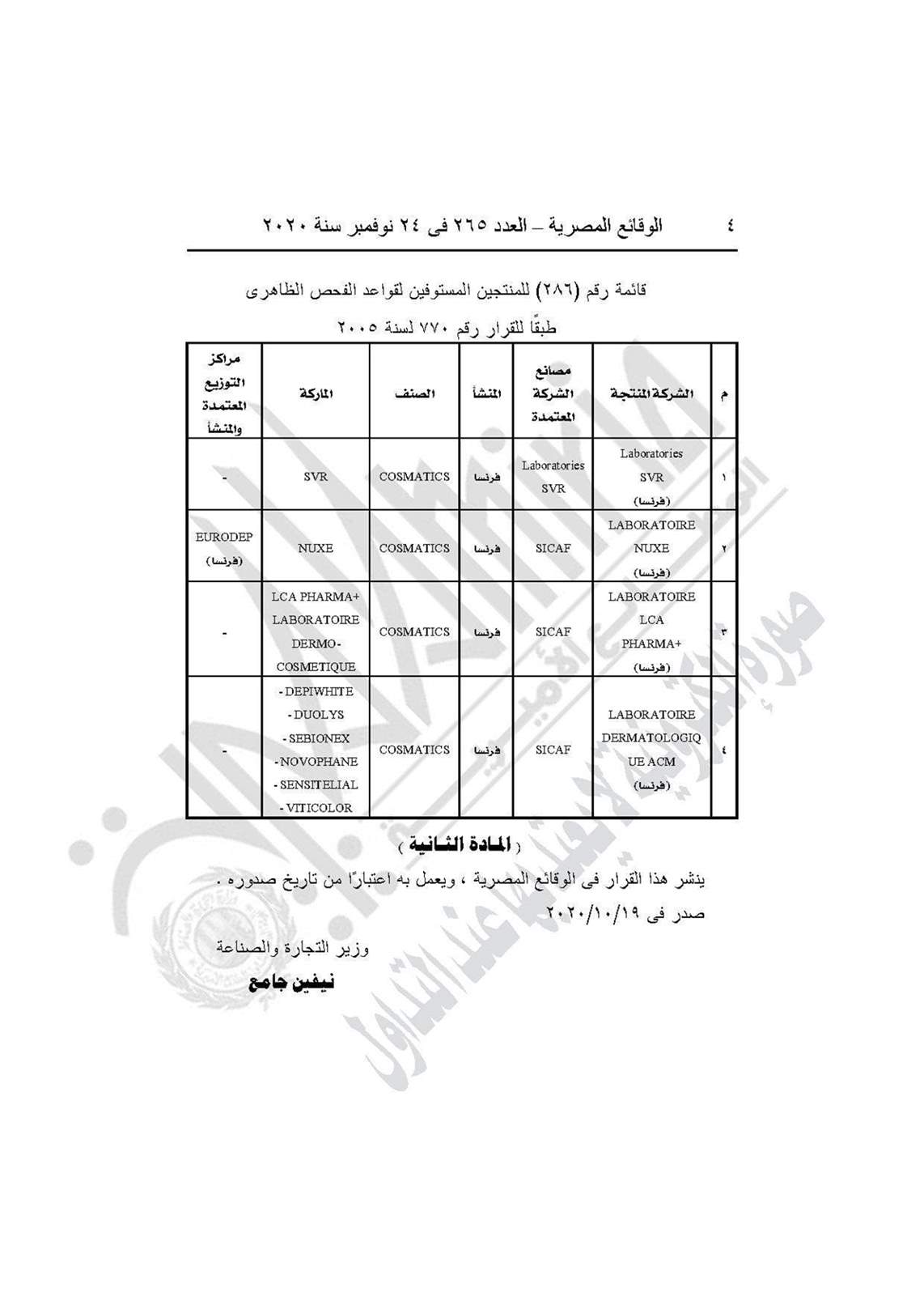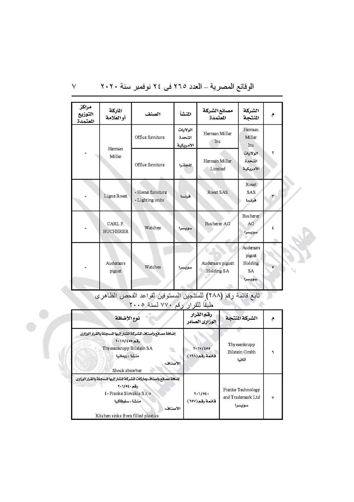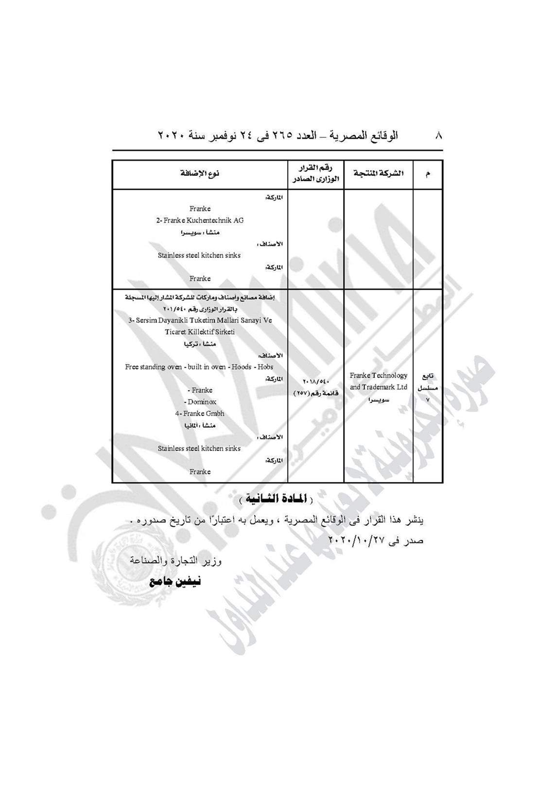 نشرت جريدة الوقائع المصرية في عددها رقم 265، الصادر في 24 نوفمبر 2020، قرارا وزارة التجارة والصناعة بقيد منتجين في 11 شركة في سجل منتجي السلع الصناعية غير الغذائية.