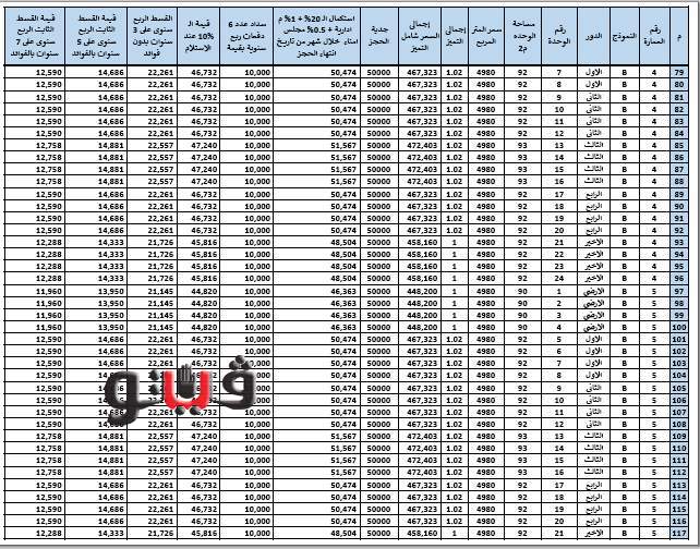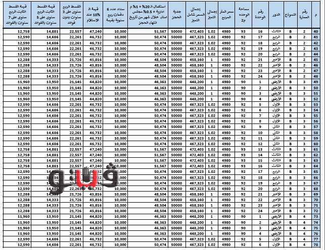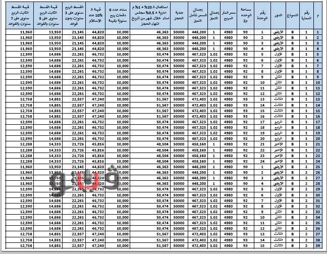 وقائمة أسعار الوحدات السكنية المطروحة كالتالي: