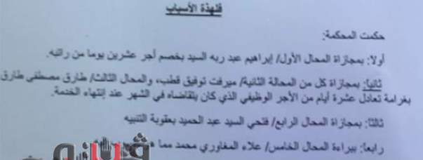 كما تضمن الحكم تغريم طارق محمد مصطفى، رئيس الإدارة المركزية للشئون المالية والإدارية بالهيئة بما يعادل 10 أيام من أجره الوظيفي قبل إنتهاء خدمته، ومجازاة فتحي السيد عبد الحميد، رئيس الإدارة المركزية للشئون المالية والإدارية بعقوبة التنبيه، بعد ثبوت أنهما أهملا في الإشراف والمتابعة والرقابة على أعمال مرءوسيهم بالإدارة العامة للموارد البشرية مما ترتب عليه ارتكابهم المخالفات المنسوبة إليهم، وتقاعسا عن متابعة الموقف الوظيفي للمحال الخامس مما ترتب عليه إستمراره في وظيفته القيادية بدون سند من القانون.