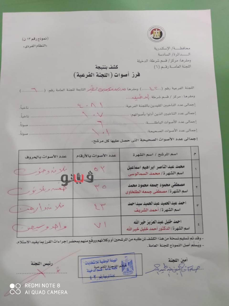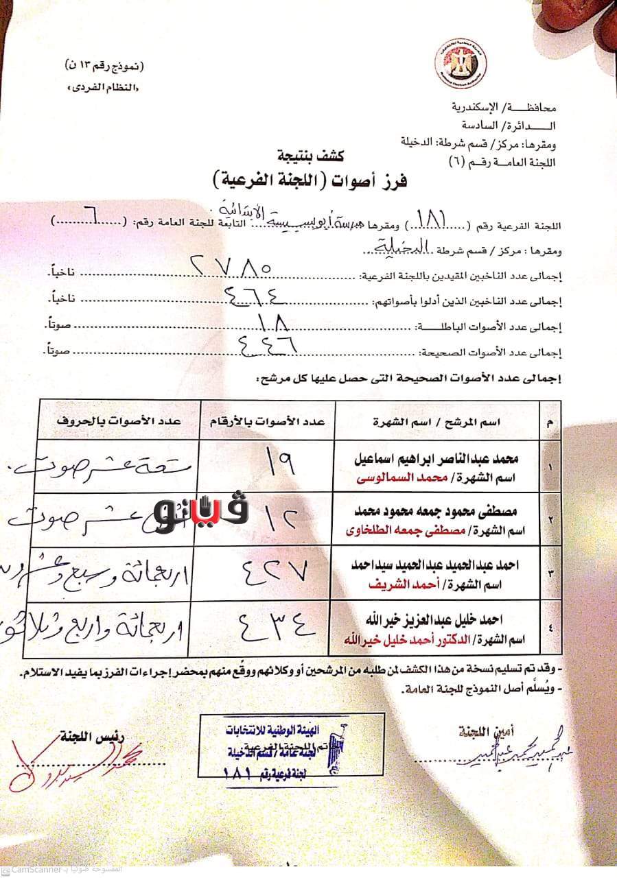 أعلنت عدد من اللجان المشرفة على انتخابات النواب الحصر العددي لأصوات المرشحين، وجاء الحصر العددي للمرشحين لجنه رقم ١٨١ بمدرسة أبوبسيسة الابتدائية بدائرة الدخيلة والعامرية وبرج العرب، كالتالي "محمد السمالوسي ١٩ صوت، مصطفى الطلخاوي ١٢، أحمد الشريف، ٤٢٧ صوت، أحمد خليل خيرالله ٤٣٤ صوت".