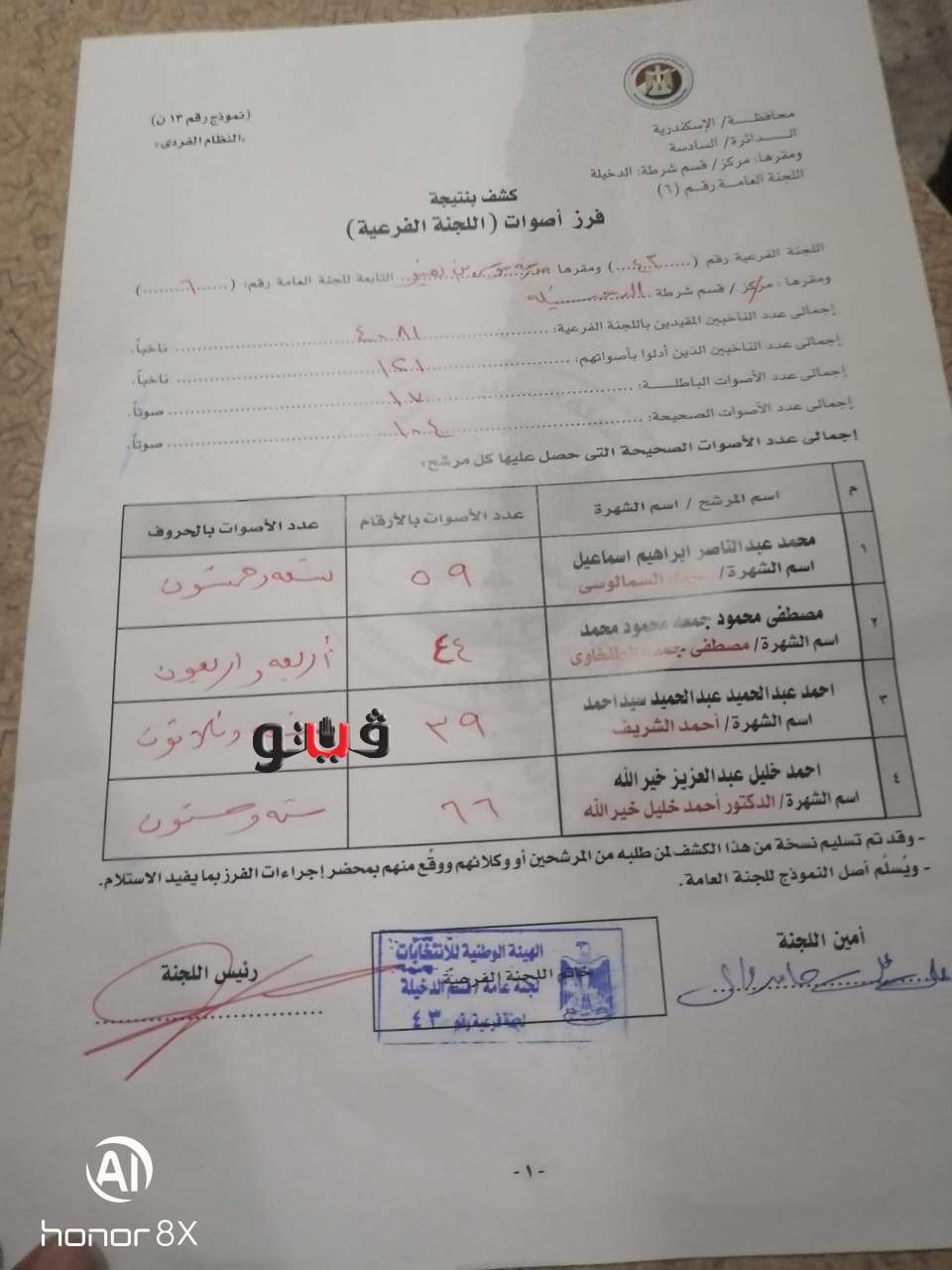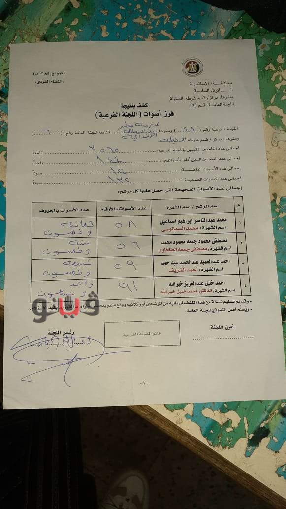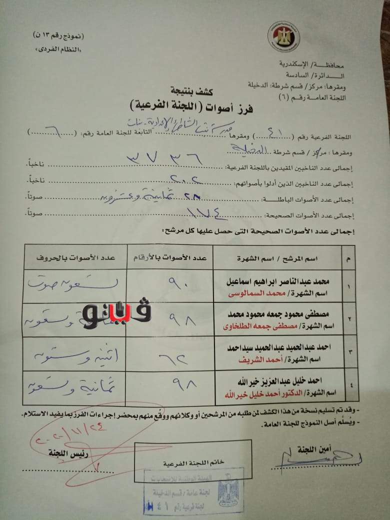 وفي لجنه ٤١ بمدرسة بنت الشاطئ حصل محمد السمالوسي على ٩٠ صوت، مصطفى الطلخاوي على ٩٨ صوت، أحمد الشريف ٦٢صوت، أحمد خليل خيرالله ٩٨ صوت،وعدد الأصوات التي أدلت بصوتها ٢٠٢صوت، و٢٥ صوت باطل