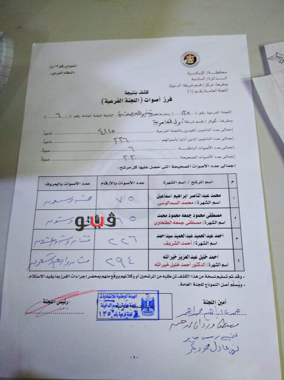 وفي لجنه ٧٢مدرسة وادي القمر حصل محمد السمالوسي على ١٧٠ صوت، مصطفى الطلخاوي ١٤٨صوت، أحمد الشريف ١١٩ ، أحمد خليل خيرالله ١٧١صوت، من إجمالي عدد الناخبين ٣٣٣، و٢٩أصوات باطلة.