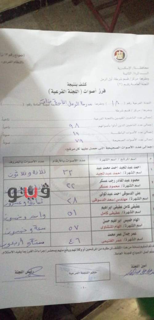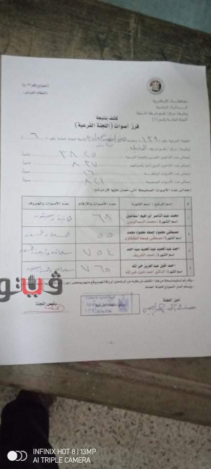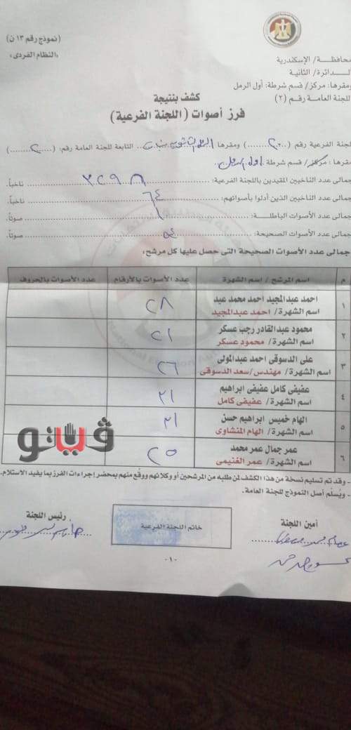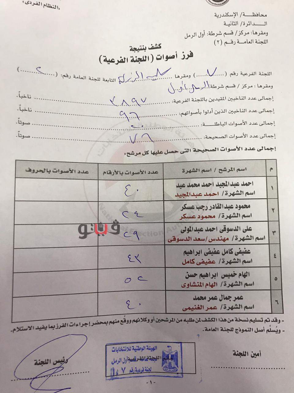 أعلنت عدد من اللجان الفرعية الحصر العددي لأصوات المرشحين، وجاء الحصر العددي للمرشحين بلجنة رقم 2 مدرسة جمال الدين الابتدائية ، كالتالي " احمد عبد المجيد 105 ومحمود عبد القادر عسكر 40صوت وعلى الدسوقى 85 صوت وعفيفى كامل 82 إلهام المنشاوى 95 صوت وعمر الغنيمى 127 صوتا.