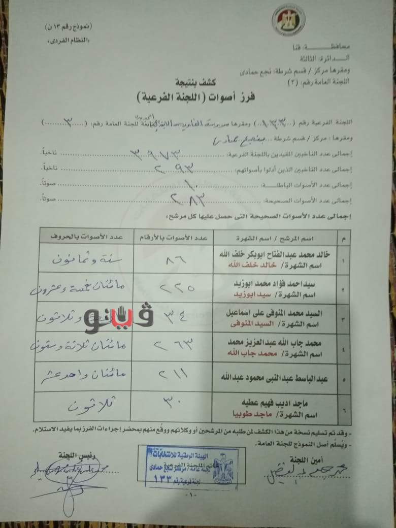 أظهر الحصر العددي للجنتي 133 ومقرها مدرسة القناوية الابتدائية المشتركة الجديدة ، و195 بدشنا الابتدائية التابعين لمركز دشنا ،شمال محافظة قنا، والتي بلغ عدد الناخبين المقيدين 3134 بلجنة 133 و3973 بلجنة رقم 195 ومن ادلوا باصواتهم368 والثانية 293 وبلغ عدد الاصوات الباطلة8 والثانية 10 والاصوات الصحيحة 360 والثانية 283.