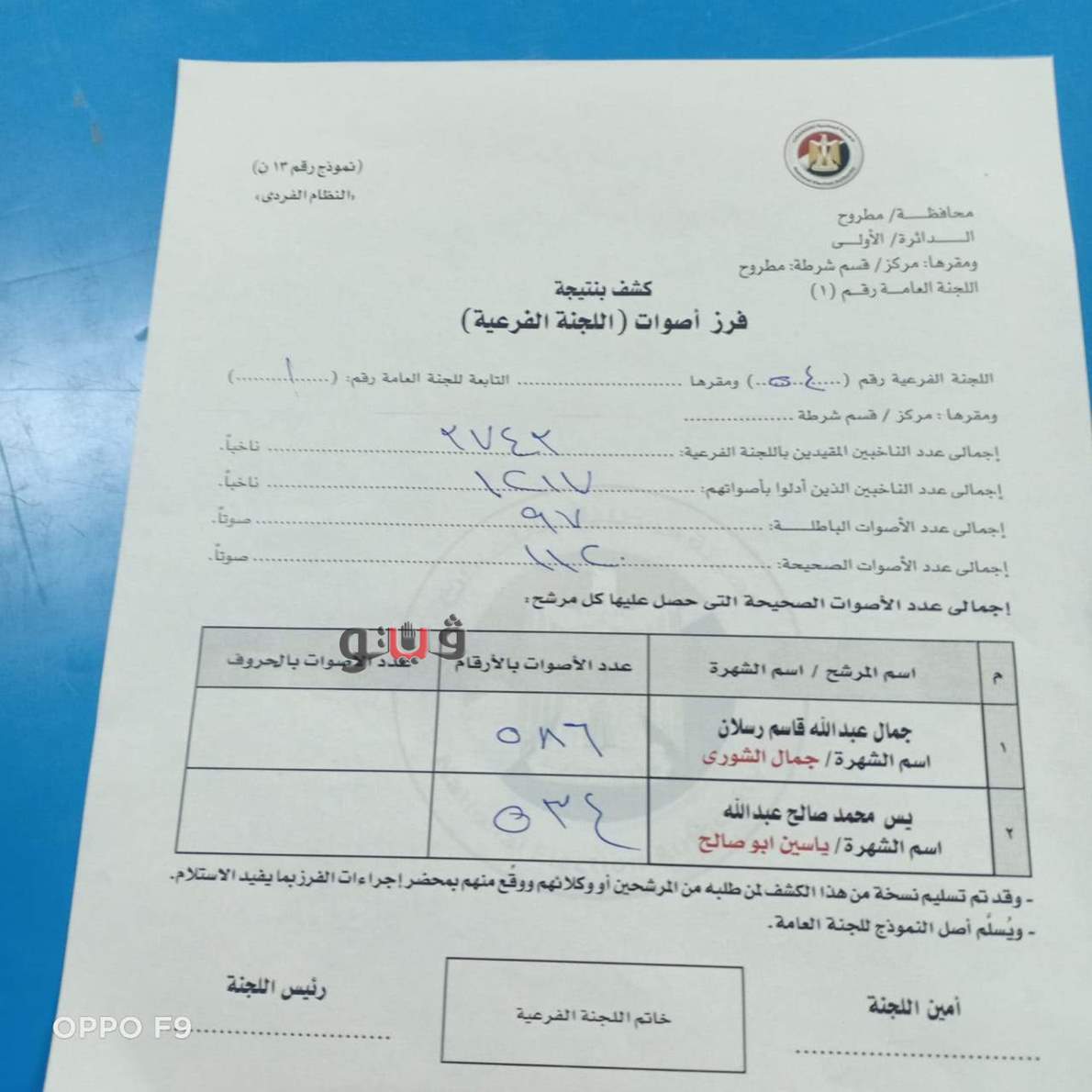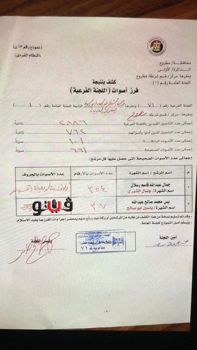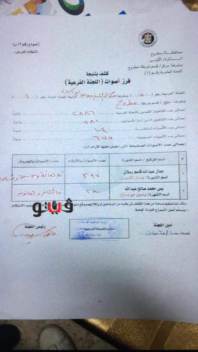 و عمليات الفرز باللجنة الفرعية رقم ٧٠ بدائرة مرسي مطروح الحصر العددي لأصوات المرشحين بواقع ٣٩٧ صوتًا للمرشح جمال عبد الله قاسم رسلان وشهرته جمال الشورى، وبواقع ٢٨٠ صوت للمرشح يس محم صالح عبد الله وشهرته ياسين ابو صالح.