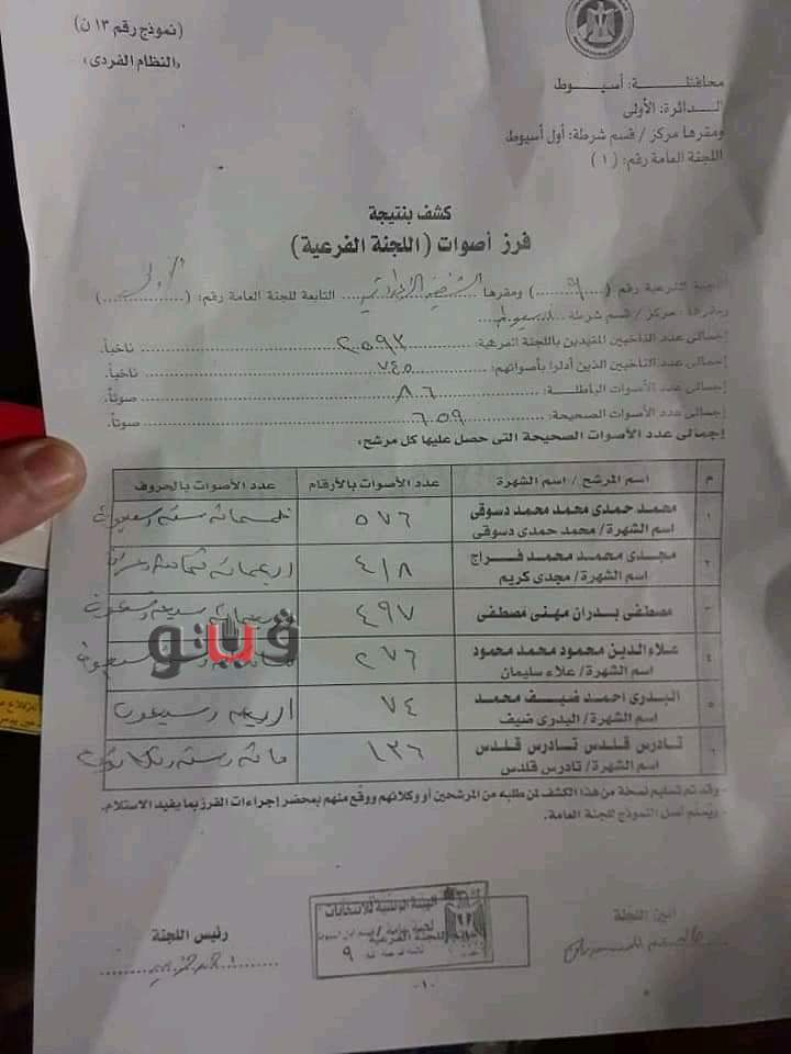 أظهرت عمليات الفرز باللجنة الفرعية رقم 8 ومقرها مدرسة الشغبة الإعدادية الحديثة التابعة للجنة العامة رقم ١، ومقرها مركز أول أسيوط الحصر العددي للمرشحين بإجمالي عدد الأصوات 765 أدلوا بأصواتهم من أصل 2592 وإجمالي عدد الأصوات الباطلة 14 والأصوات الصحيحة 751.
