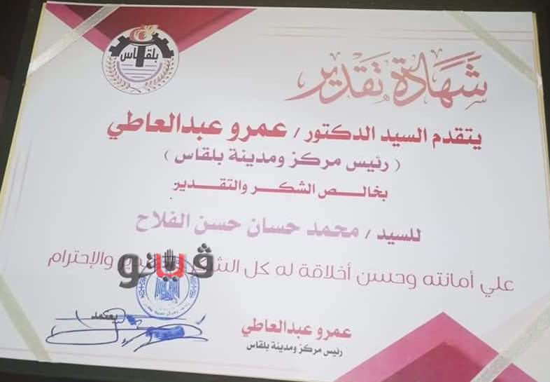عبد العاطي رئيس مركز ومدينة بلقاس، سائق التوك توك محمد حسان حسن الفلاح، لأمانته، ورده مبلغ مائة ألف جنيه عثر عليها بالتوكتوك الخاص به وعلى الفور قام بتسليم المبلغ