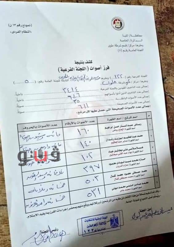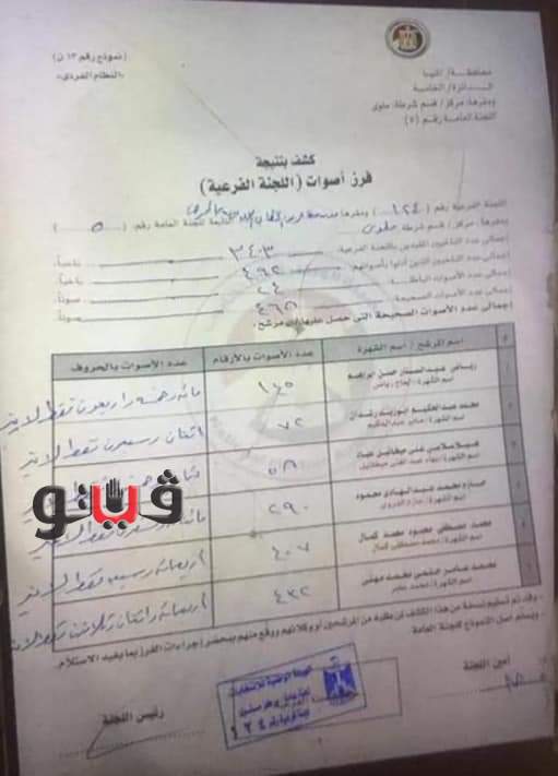 أظهرت عمليات فرز الأصوات لـ 4 لجان فرعية "لجان قرية المحرص" التابعة لدائرة بندر ومركز ملوي جنوبي محافظة المنيا هم : لجنة "122 _ 123 _ 124 _ 125" حيث جاء الحصر العددي للأصوات بواقع 617 صوتا للمرشح رياض عبد الستار، مستقبل وطن.