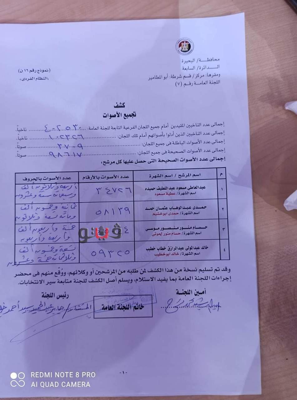 أظهرت عمليات الفرز للدائرة السادسة بأبو المطامير في البحيرة الحصر العددي لأصوات المرشحين بواقع 34 ألفاً و726 صوتاً للمرشح عبد العاطي مسعود عبد اللطيف حميدة وشهرته "عطية مسعود" و 58 ألفاً و 129 صوتاً للمرشح حمدي عبد الوهاب عثمان حمد وشهرته حمدي أبو خشيم.