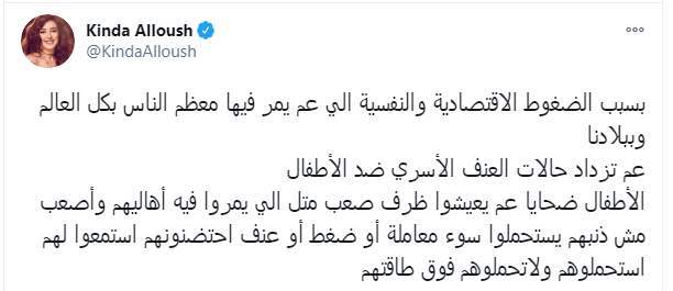 وكتبت كندا علوش تغريدة على تويتر قالت فيها "بسبب الضغوط الاقتصادية والنفسية اللي عم يمر فيها معظم الناس بكل العالم وببلادنا عم تزداد حالات العنف الأسري ضد الأطفال".