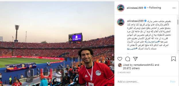 وعلق ربيع علي الصورة قائلاً «بقميص منتخب مصر ببارك للأهلي والزمالك علي نهائي أفريقيا كلنا واحد كلنا بنشجع مصر و الماتش يطلع جميل ويشرف الكورة المصرية قدام العالم كله».