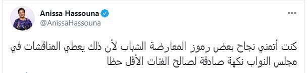 وكتبت أنيسة حسونة تغريدة على تويتر: "كنت أتمنى نجاح بعض رموز المعارضة الشباب لأن ذلك يعطي المناقشات في مجلس النواب نكهة صادقة لصالح الفئات الأقل حظا".