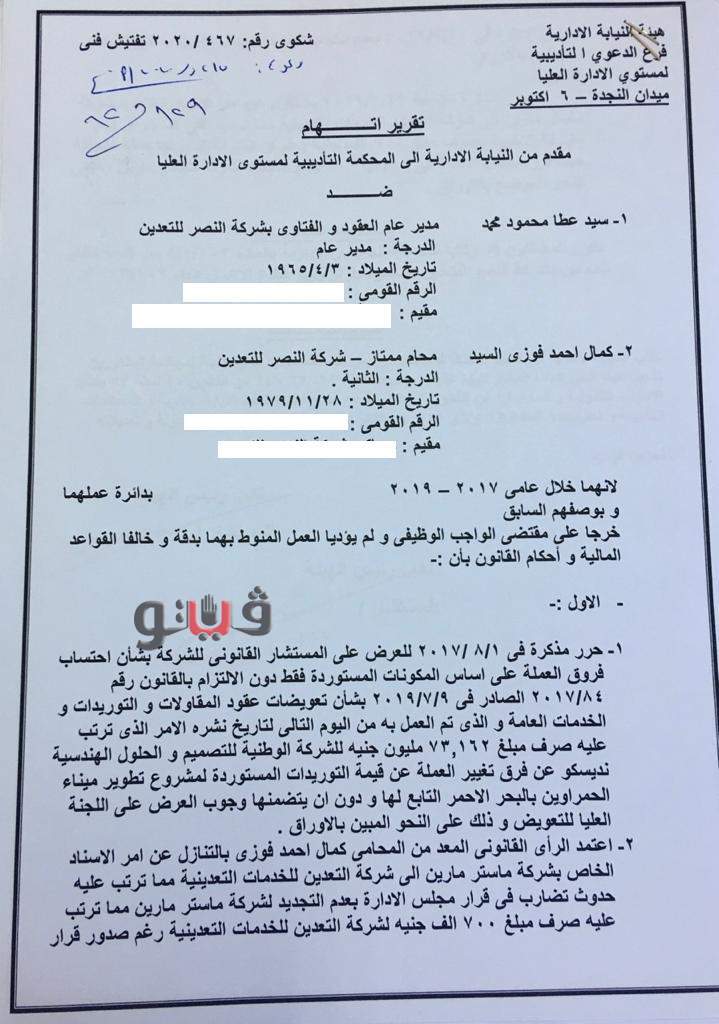 وأكد البلاغ أن المحال الأول ارتكب مخالفة ماليه كلفت الشركه خسائر باهظه منها ما تم دفعه كاش بشيكات 73 مليون جنيه فضلًا عن الخسائر الاخرى التي ما زالت سارية لتعطيل مشروع تطوير ميناء تصديرى للشركه لبعض منتجاتها حيث قام بتحرير مذكره برأيه القانون فى موضوع صرف مبلغ 73 مليون جنيه للشركة الوطنية للحلول الهندسية المتعاقد معها لشركه المقاولون العرب من الباطن لتطوير مشروع ميناء الحمراوين الخاص بالشركة والتى بلغت تكلفته آنذاك 385 مليون جنيه من فروق تغيير العملة عن قيمه التوريدات المستوردة بمشروع تطوير الحمراوين بالمخالفه للقانون رقم 84 لسنة 2017