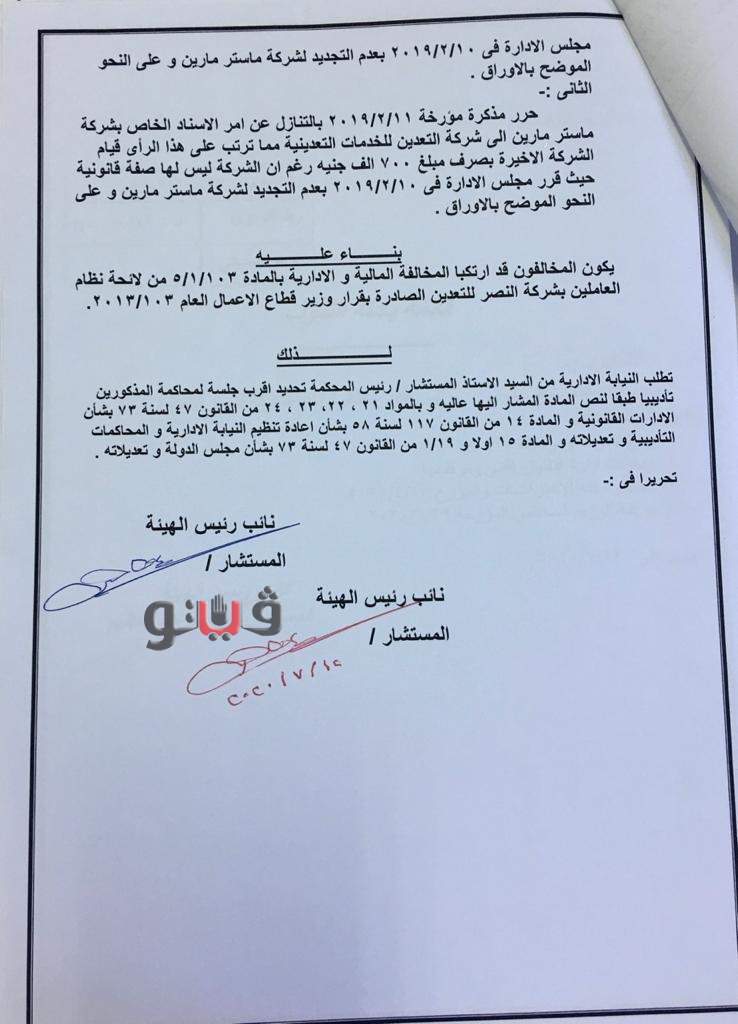 وتبين من أوراق القضية إعتمد الرأي القانونى المعد من المحامي كمال احمد فوزى "المحال الثاني" بالتنازل عن أمر الاسناد الخاص بشركة ماستر مارين الى شركة التعدين للخدمات التعدينية مما ترتب علية حدوث تضارب في قرار مجلس الادارة بعدم التجديد لشركة ماستر مارين مما ترتب عليه صرف مبلغ 700 الف جنيه لشركة التعدين للخدمات التعدينية رغم صدور قرار مجلس الادارة فى 10 فبراير 2019 بعدم لتجديد لشركة ماستر مارين