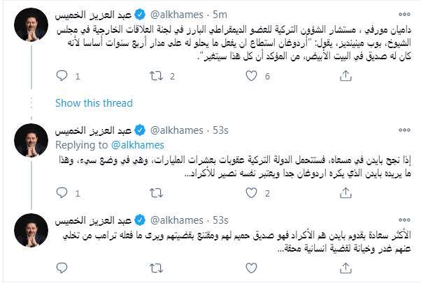وكتب عبد العزيز الخميس تغريدة على تويتر: "داميان مورفي، مستشار الشؤون التركية للعضو الديمقراطي البارز في لجنة العلاقات الخارجية في مجلس الشيوخ، بوب مينينديز، يقول: "أردوغان استطاع ان يفعل ما يحلو له على مدار أربع سنوات أساسا لأنه كان له صديق في البيت الأبيض، من المؤكد أن كل هذا سيتغير".