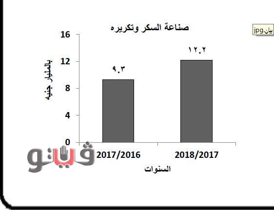 أكد تقرير صادر عن الجهاز المركزى للتعبئة العامة والإحصاء أن قيمة الإنتاج فى صناعة السكر وتكريره 12.2 مـليــار جـنيـه عام 2017/2018 مقــابل 9.3 مليـــار جنيــه عام 2016/2017 بارتفاع بلغ نسبته 30.8%.