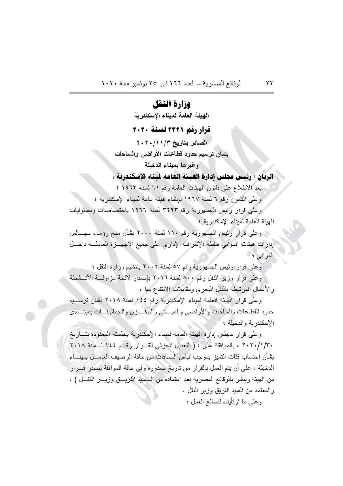 نشرت جريدة الوقائع المصرية في عددها رقم 266، الصادر في 25 نوفمبر 2020، قرارا وزارة النقل الهيئة العامة لميناء الإسكندرية، بشأن ترسيم حدود قطاعات الأراضي والساحات وغيرها بميناء الدخيلة، وتصدر بدل السفر ومصروفات الانتقال.