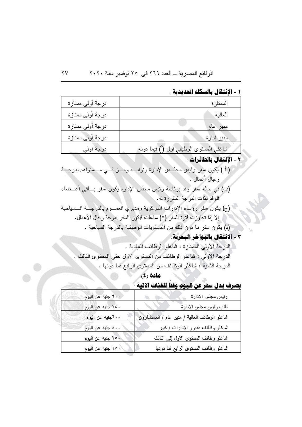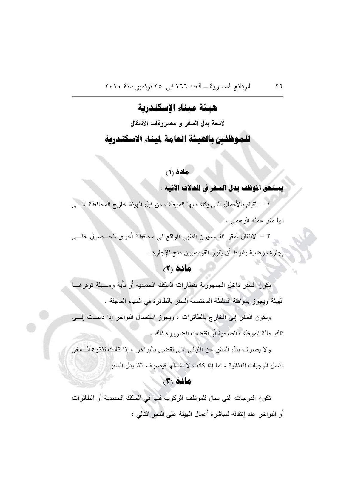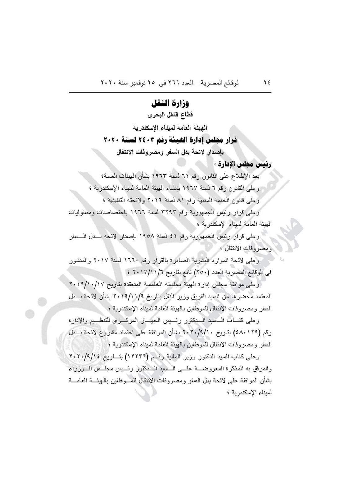 والقرار رقم 2403 لسنة 2020، بإصدار لائحة بدل السفر ومصروفات الانتقال، لائحة بدل السفر و مصروفات الانتقال للموظفين بالهيئة العامة لميناء الاسكندرية.