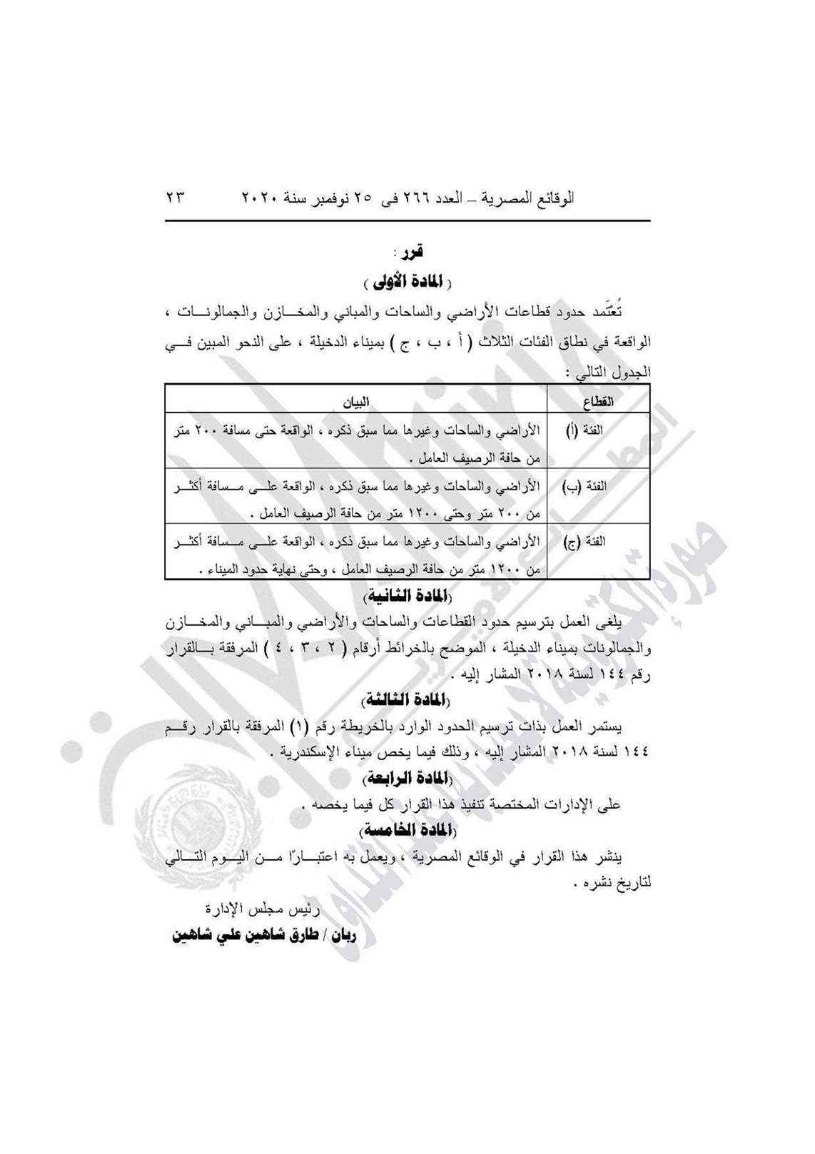 القرار رقم 2321 لسنة 2020 وينص على اعتماد حدود قطاعات الأراضي والساحات والمباني والمخازن والجمالونات الواقعة في نطاق الفئات الثلاث (أ، ب، ج) بميناء الدخيلة.