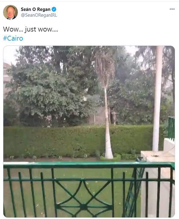 عبر شون أوريجان، سفير أيرلندا فى القاهرة، عن سعادته لهطول المطر بغزارة في القاهرة اليوم الأربعاء، وبث فيديو للأمطار الغزيرة التي سقطت داخل مكتبه بالقاهرة اليوم، بسبب الطقس السيء الذي شهدته محافظات عدة في مصر.