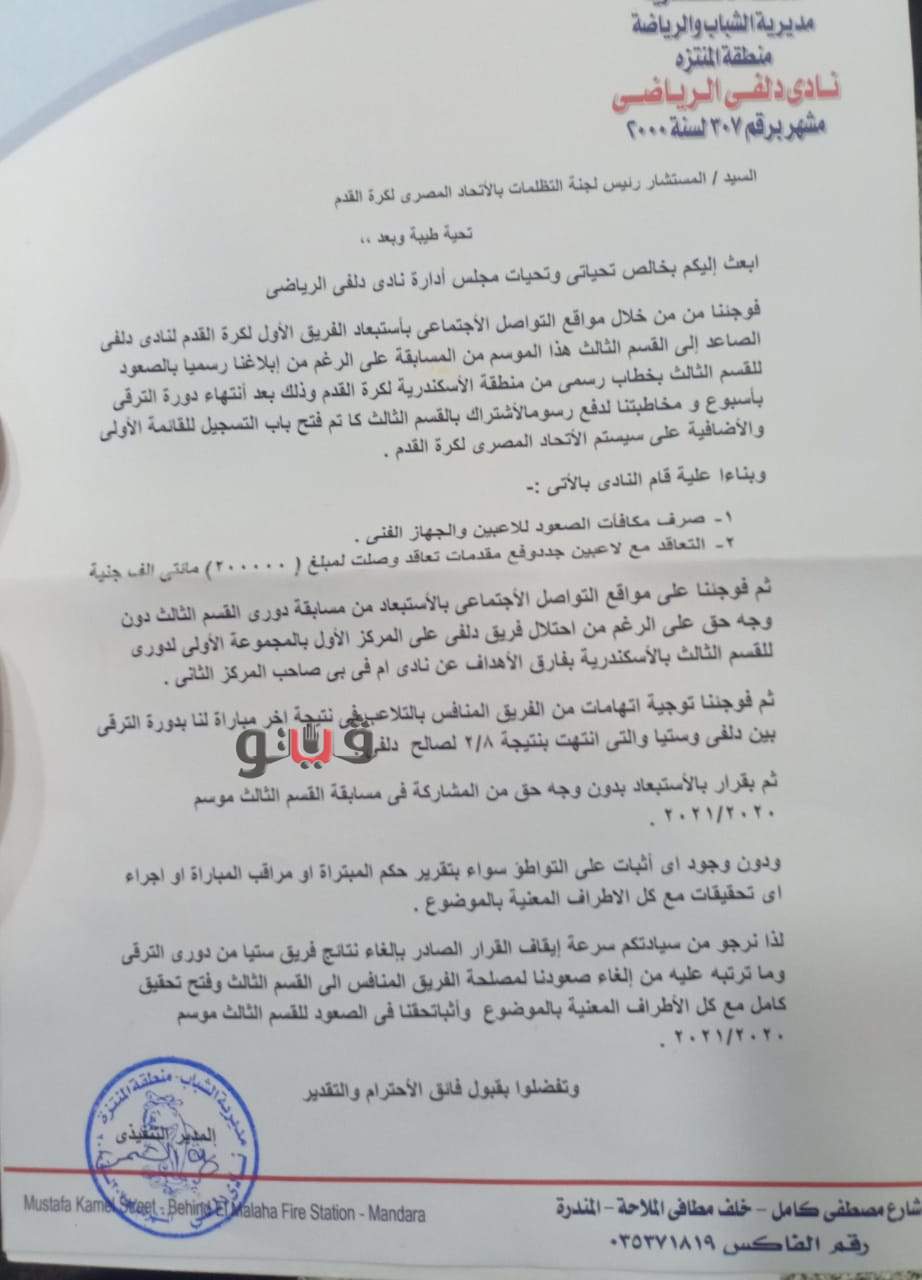 وأكد المدير الفني لفريق دلفي تقدم ناديه بشكوى اليوم في اتحاد الكرة لمعرفة سبب التراجع عن قرار تأهله لدوري القسم الثالث يؤكد خلالها أنه الأحق بالصعود، مشيرا أنه يعرف أسباب صعود فريق MVB وهي أنه يمتلكه أحد رجال الأعمال و الذى يتولى منصب رياضي كبير – رافضا ذكر إسمه -، و أنه تقدم بشكوى لمعرفة أسباب هذا القرار و أنه يطالب عمرو الجنايني رئيس الاتحاد وأشرف صبحي وزير الشباب والرياضة بالتدخل.