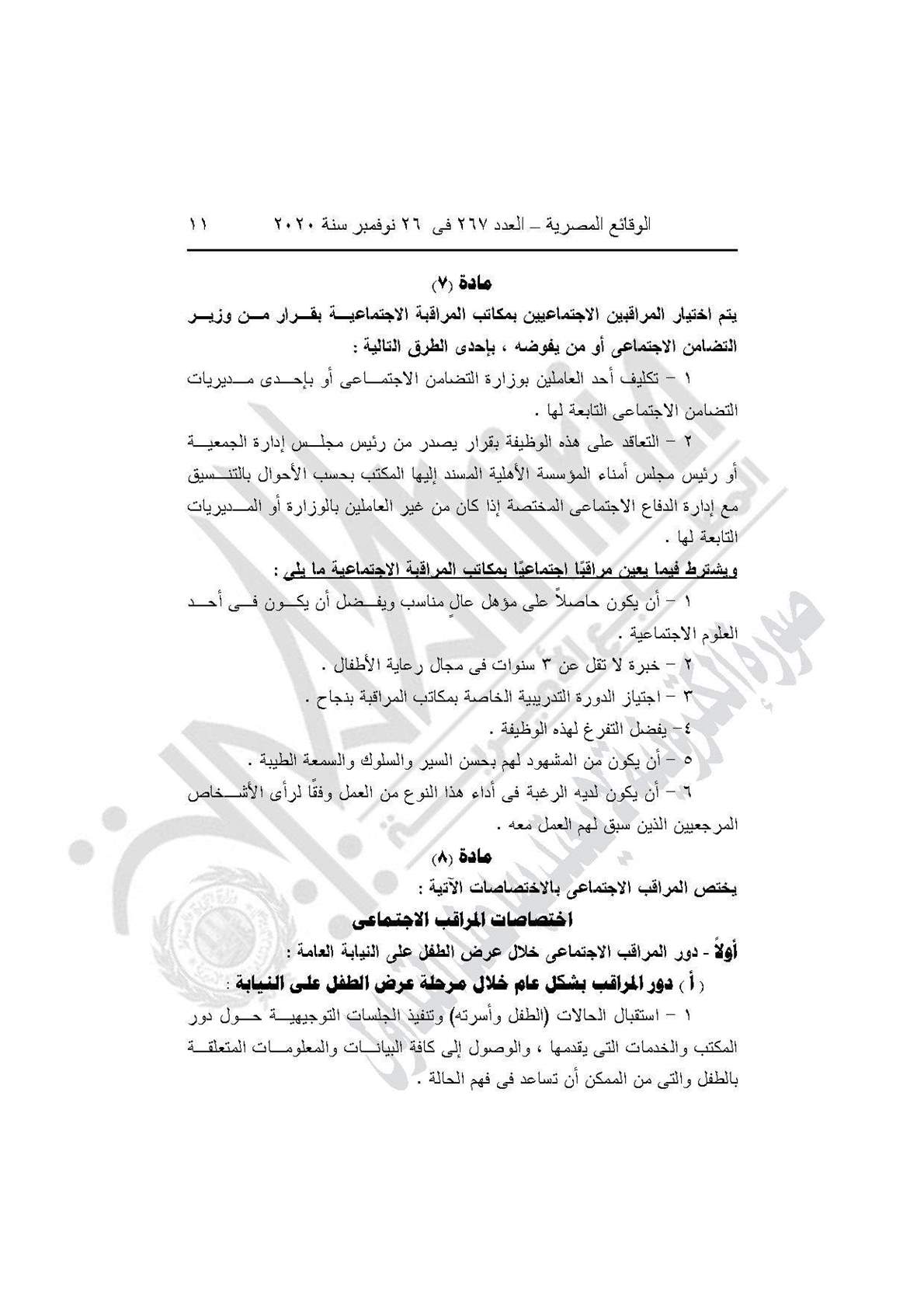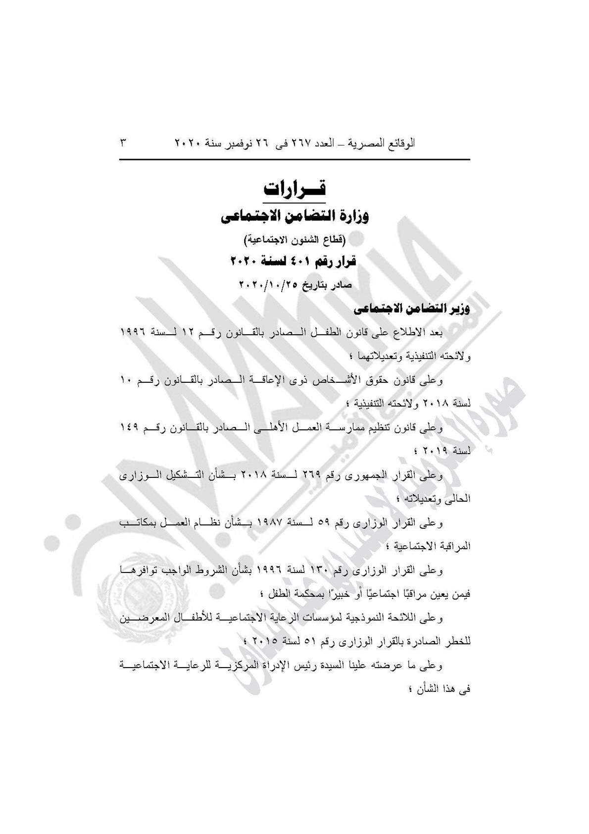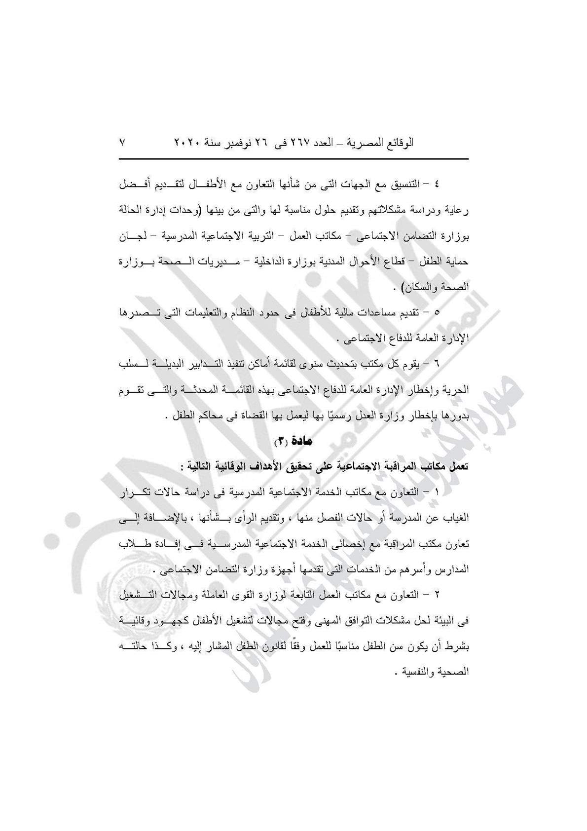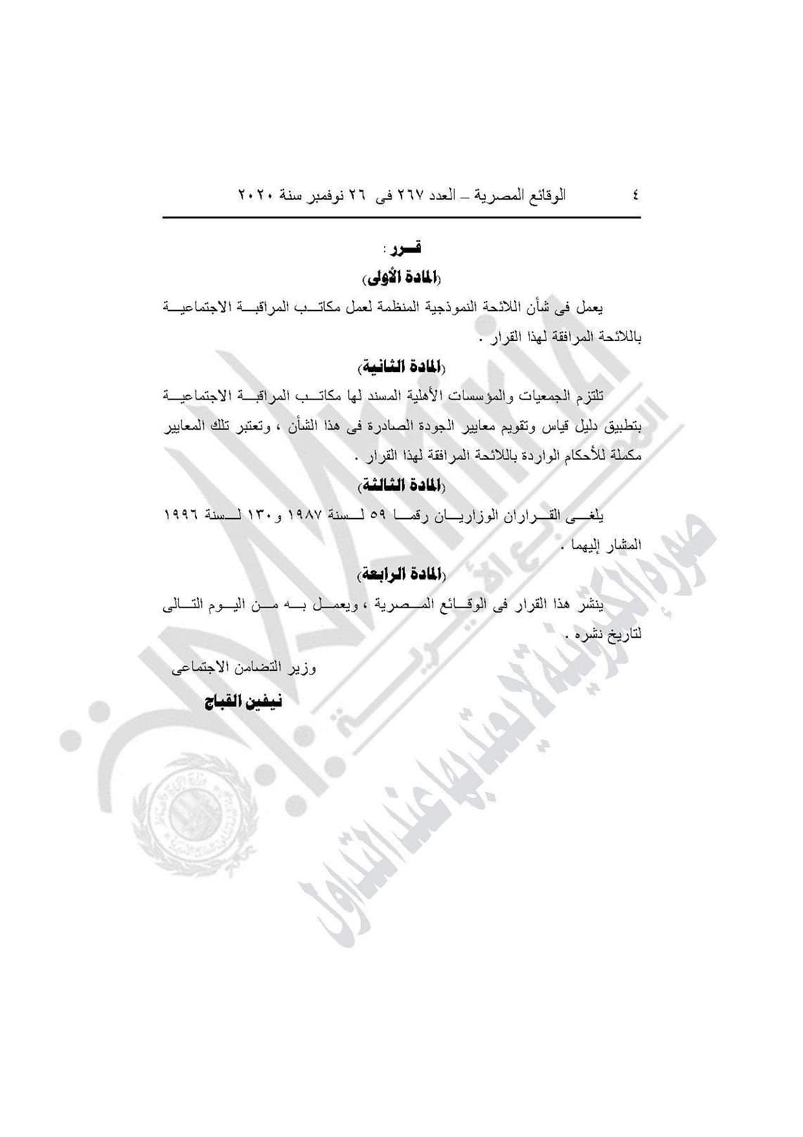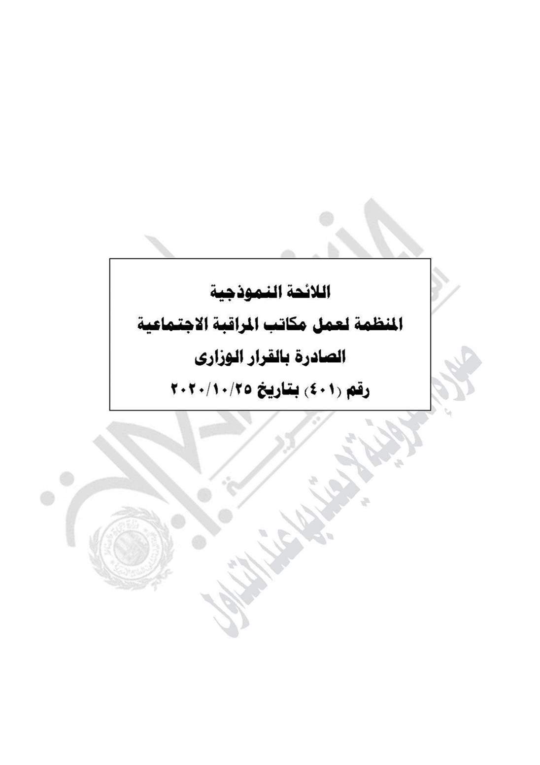 نشرت جريدة الوقائع المصرية في عددها رقم 267، الصادر في 26 نوفمبر 2020، قرار وزارة التضامن الاجتماعي رقم 401 لسنة 2020، بشأن العمل باللائحة النموذجية المنظمة لعمل مكاتب المراقبة الاجتماعية.