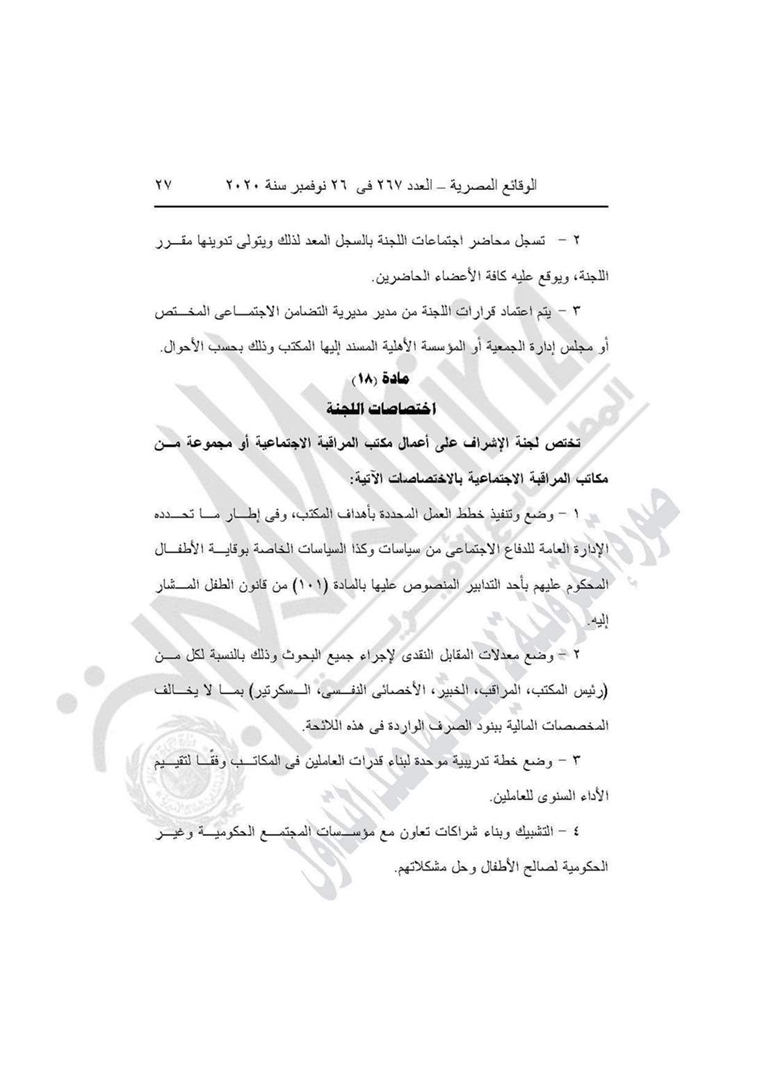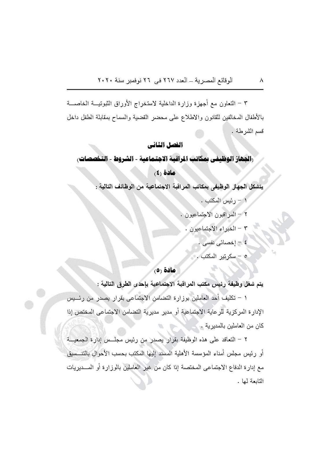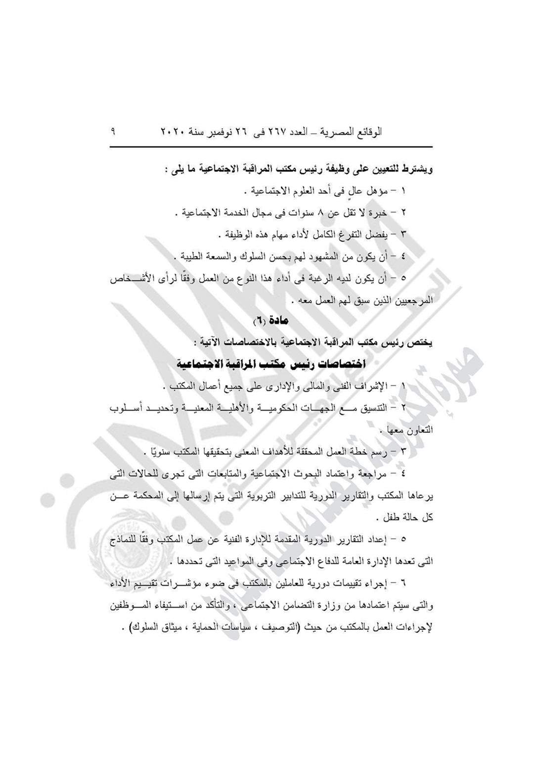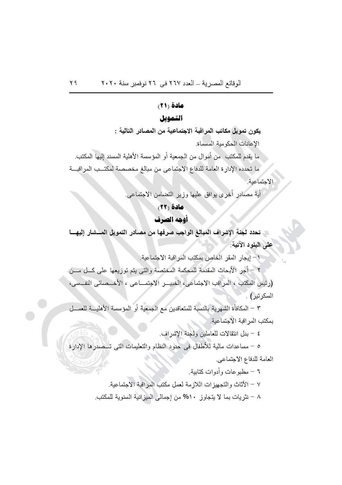نشرت جريدة الوقائع المصرية في عددها رقم 267، الصادر في 26 نوفمبر 2020، قرار وزارة التضامن الاجتماعي رقم 401 لسنة 2020، بشأن العمل باللائحة النموذجية المنظمة لعمل مكاتب المراقبة الاجتماعية.