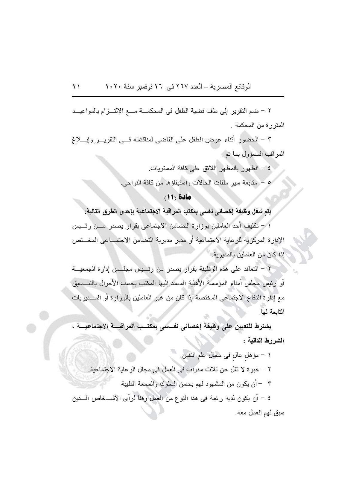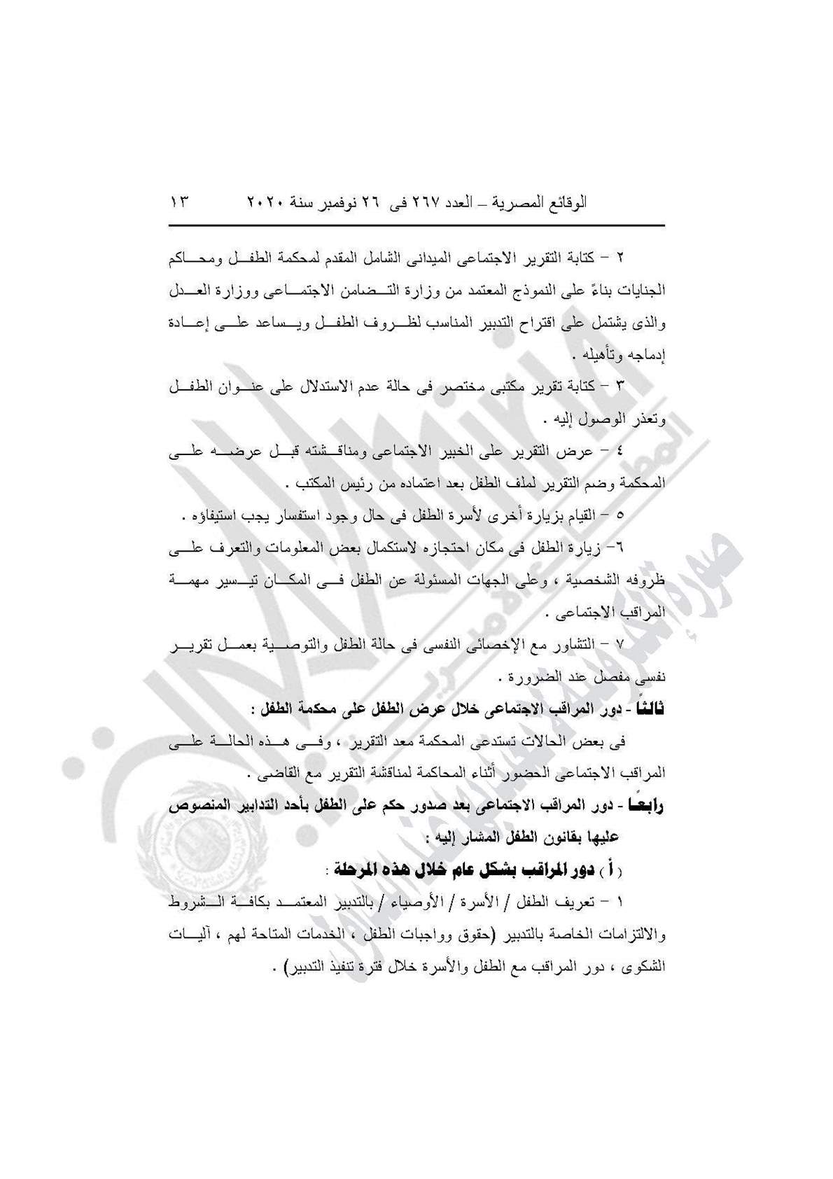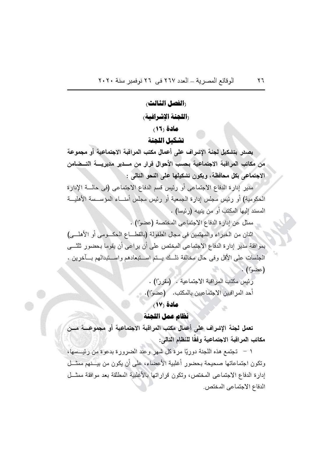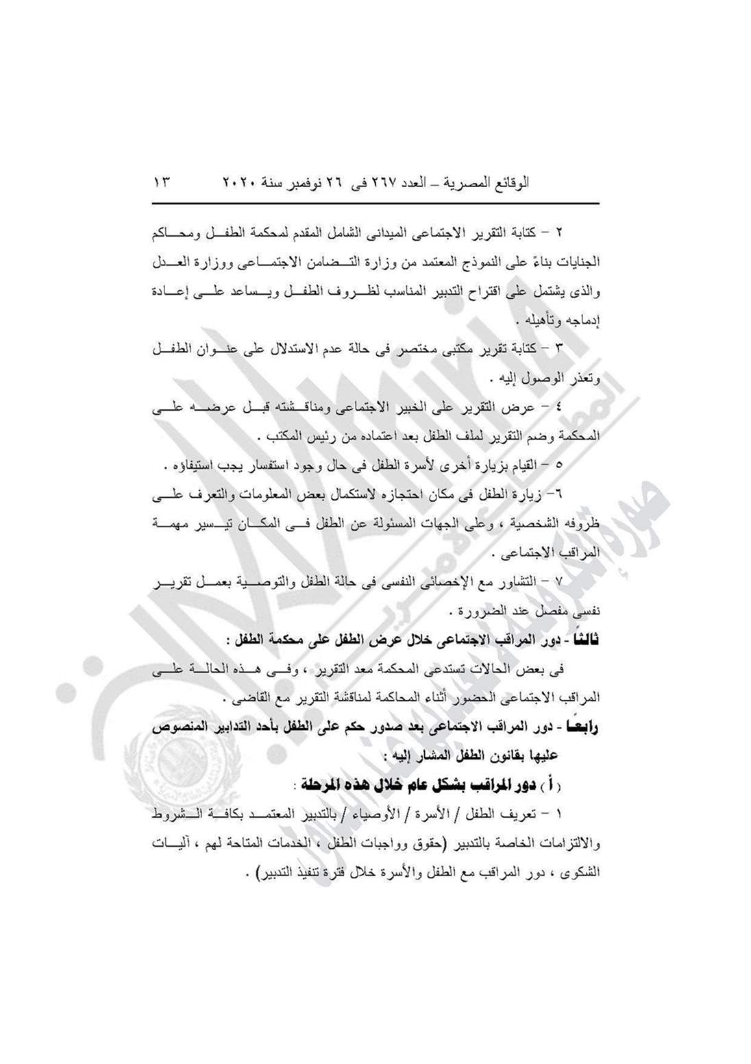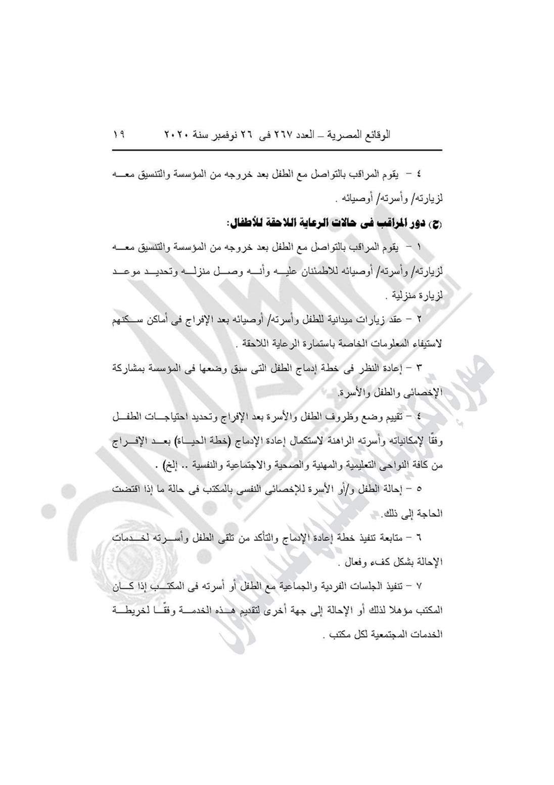 نشرت جريدة الوقائع المصرية في عددها رقم 267، الصادر في 26 نوفمبر 2020، قرار وزارة التضامن الاجتماعي رقم 401 لسنة 2020، بشأن العمل باللائحة النموذجية المنظمة لعمل مكاتب المراقبة الاجتماعية.