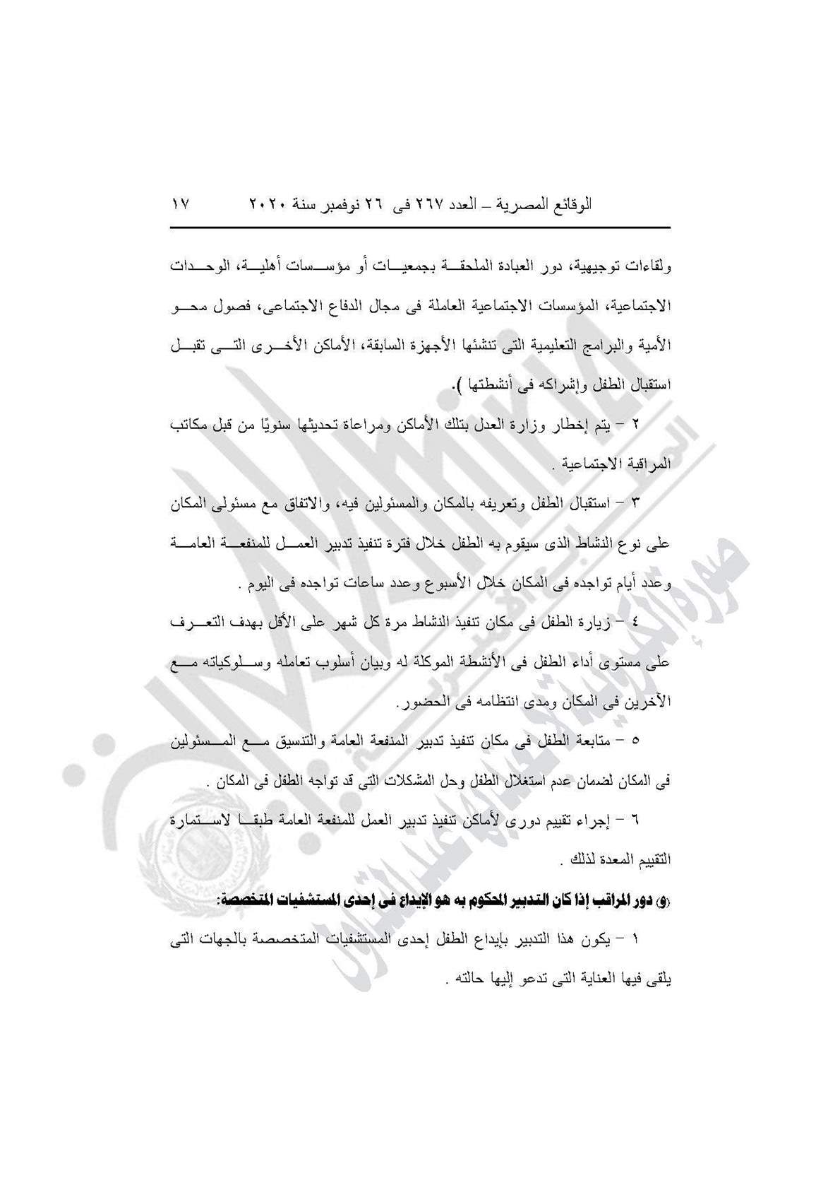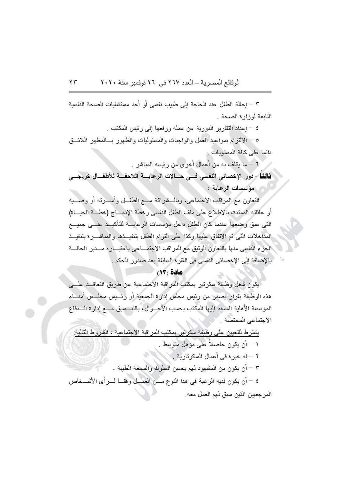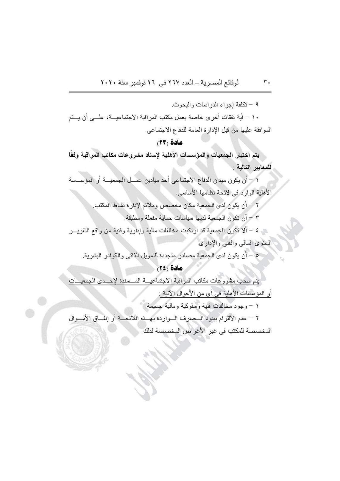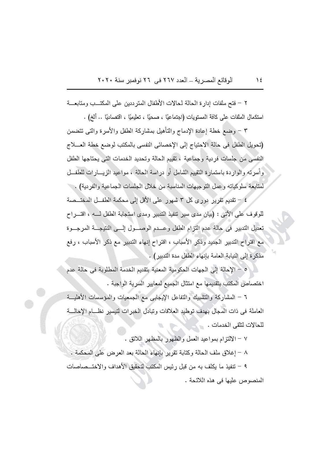 نشرت جريدة الوقائع المصرية في عددها رقم 267، الصادر في 26 نوفمبر 2020، قرار وزارة التضامن الاجتماعي رقم 401 لسنة 2020، بشأن العمل باللائحة النموذجية المنظمة لعمل مكاتب المراقبة الاجتماعية.