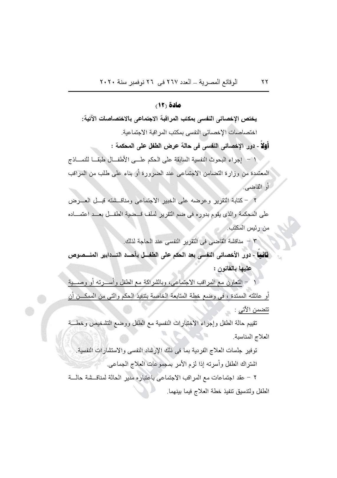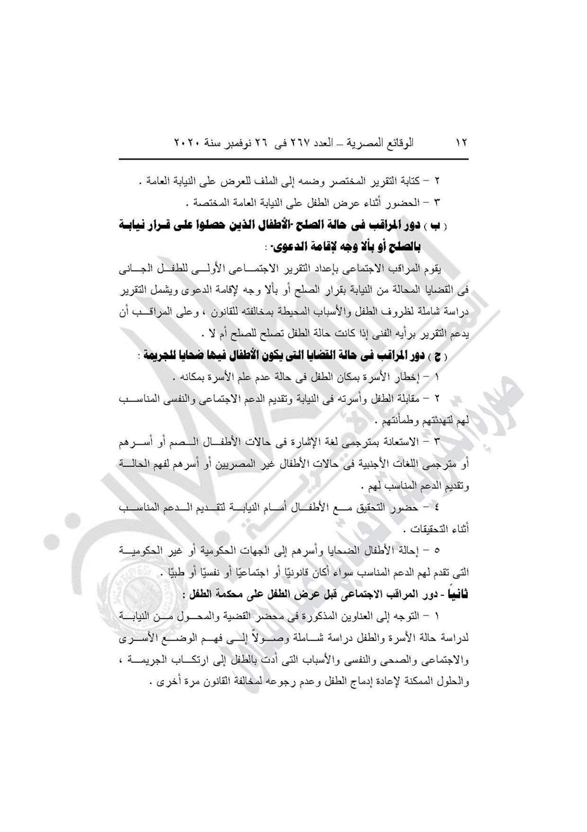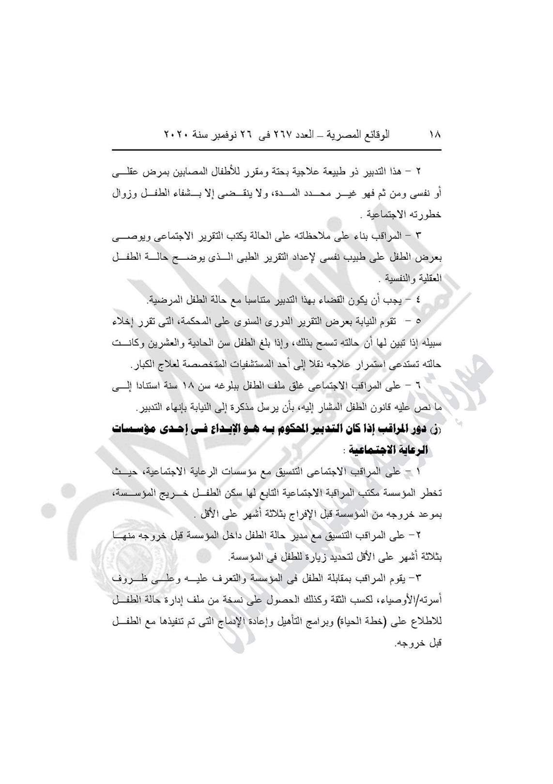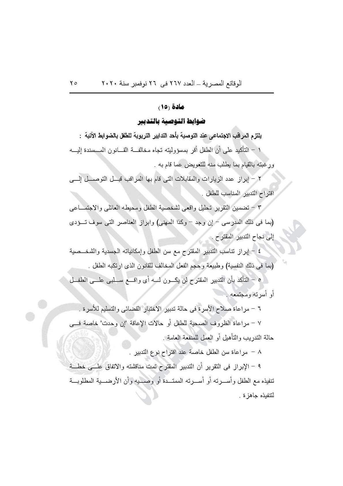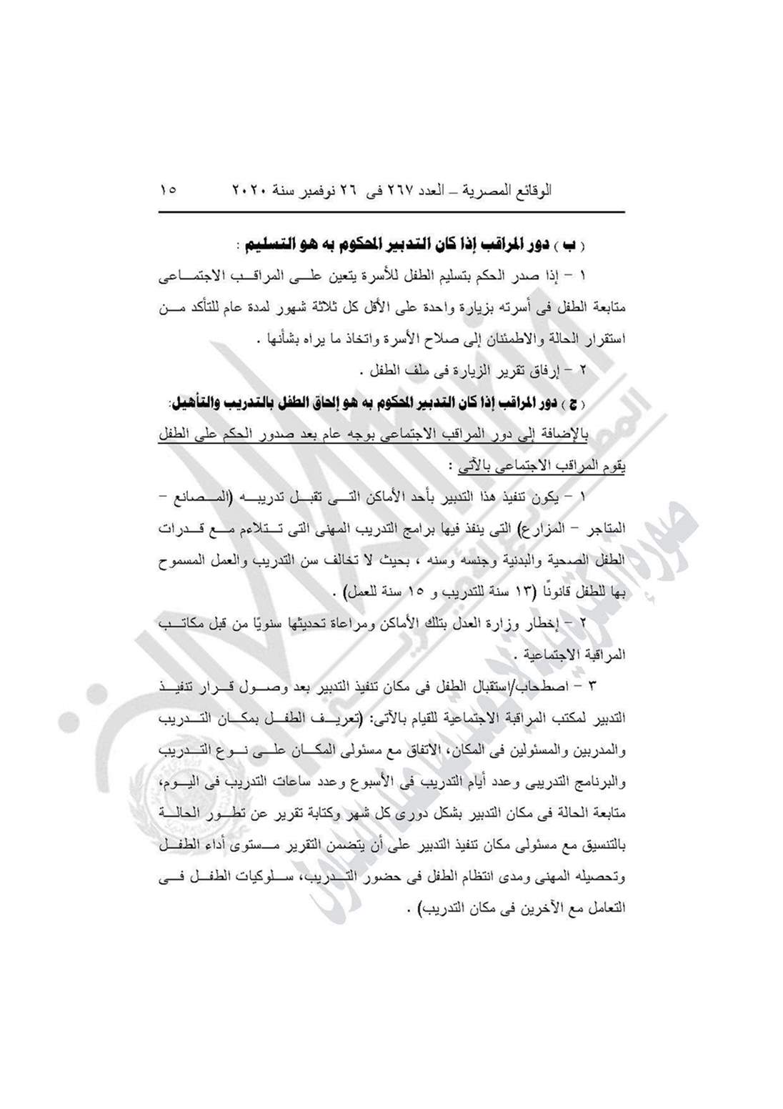 نشرت جريدة الوقائع المصرية في عددها رقم 267، الصادر في 26 نوفمبر 2020، قرار وزارة التضامن الاجتماعي رقم 401 لسنة 2020، بشأن العمل باللائحة النموذجية المنظمة لعمل مكاتب المراقبة الاجتماعية.