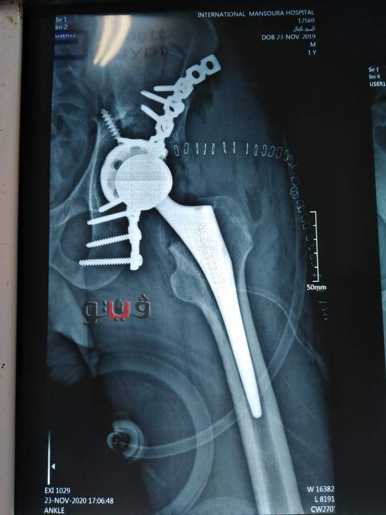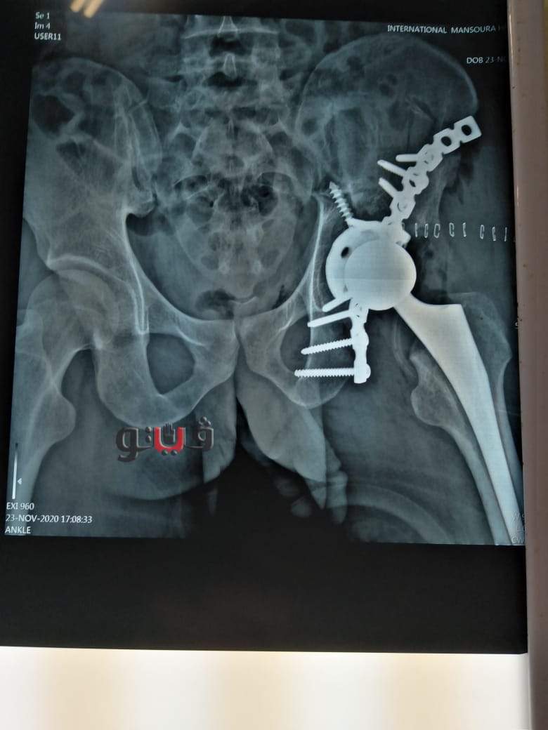 وتم تحويل المريض إلى المستشفى الدولى حيث تمكن الفريق الطبي من عمل تثبيت للكسر بشريحة بنائية مع مسامير واستبدال كامل لمفصل الفخذ بمفصل صناعي غير أسمنتي بطريقة الضغط المناسب و رفع الضغط الواقع على العصب الوركي.