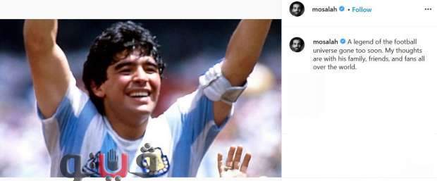 نعى النجم محمد صلاح، جناح المنتخب الوطني وفريق ليفربول الإنجليزي، أسطورة كرة القدم العالمية الأرجنتيني دييجو أرماندو مارادونا.