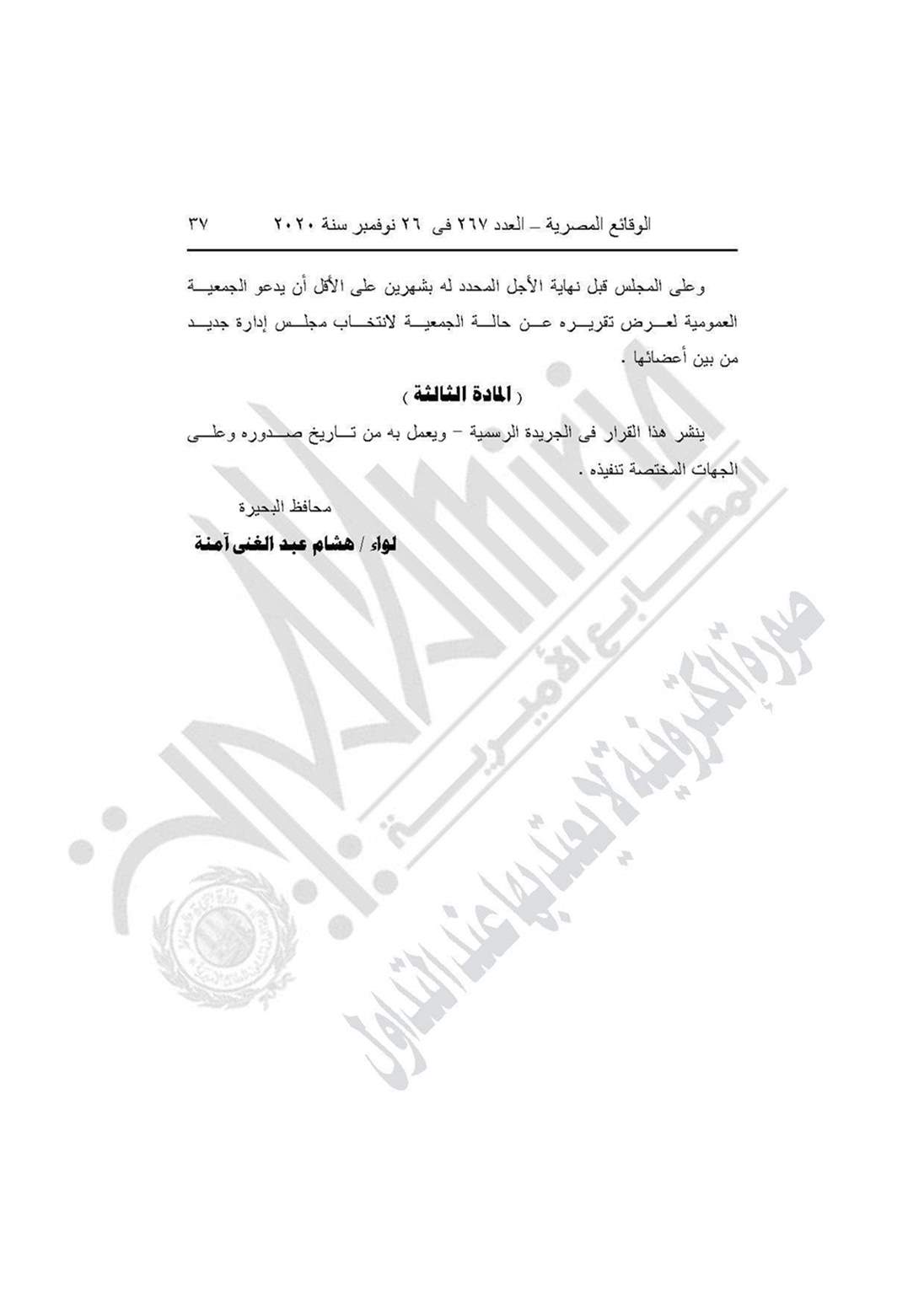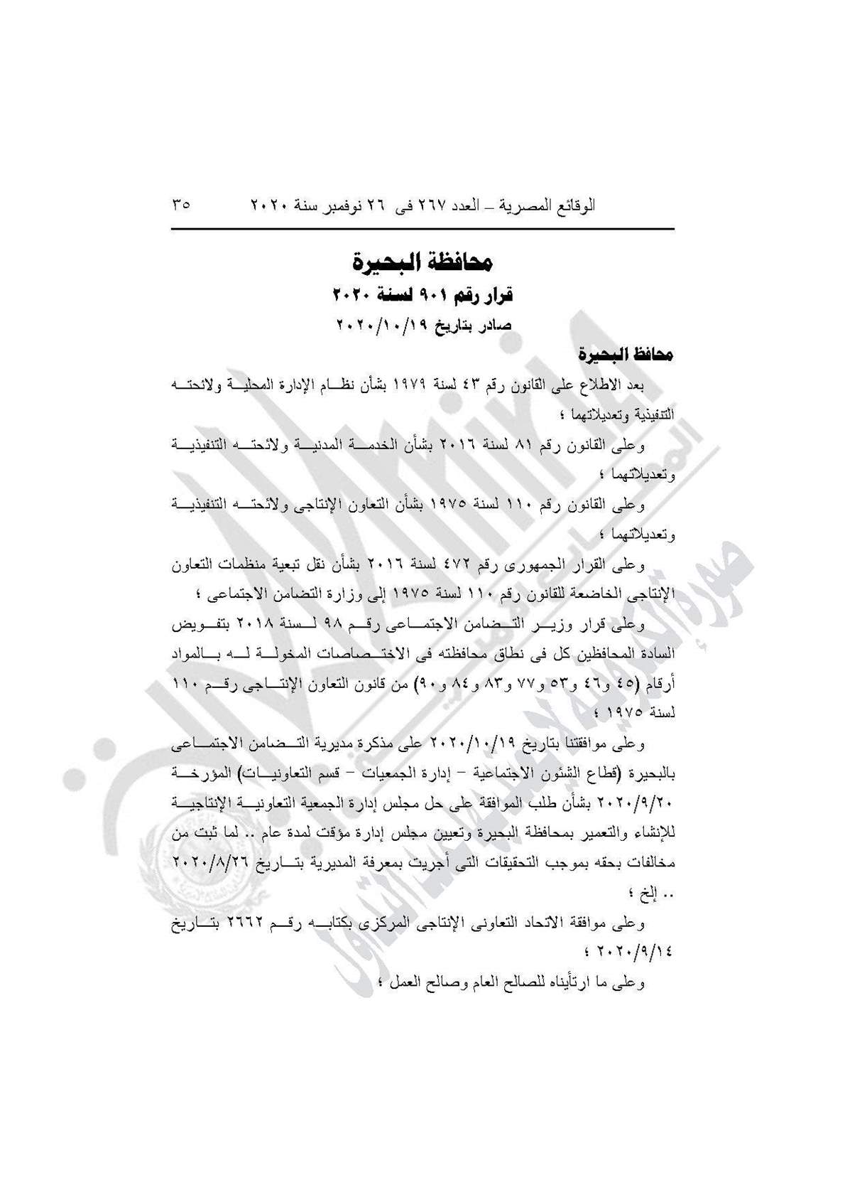 نشرت جريدة الوقائع المصرية في عددها رقم 267، الصادر في 26 نوفمبر 2020، قرار محافظة البحيرة رقم 901 لسنة 2020، بشأن حل مجلس إدارة الجمعية التعاونية الإنتاجية للإنشاء والتعمير بمحافظة البحيرة.