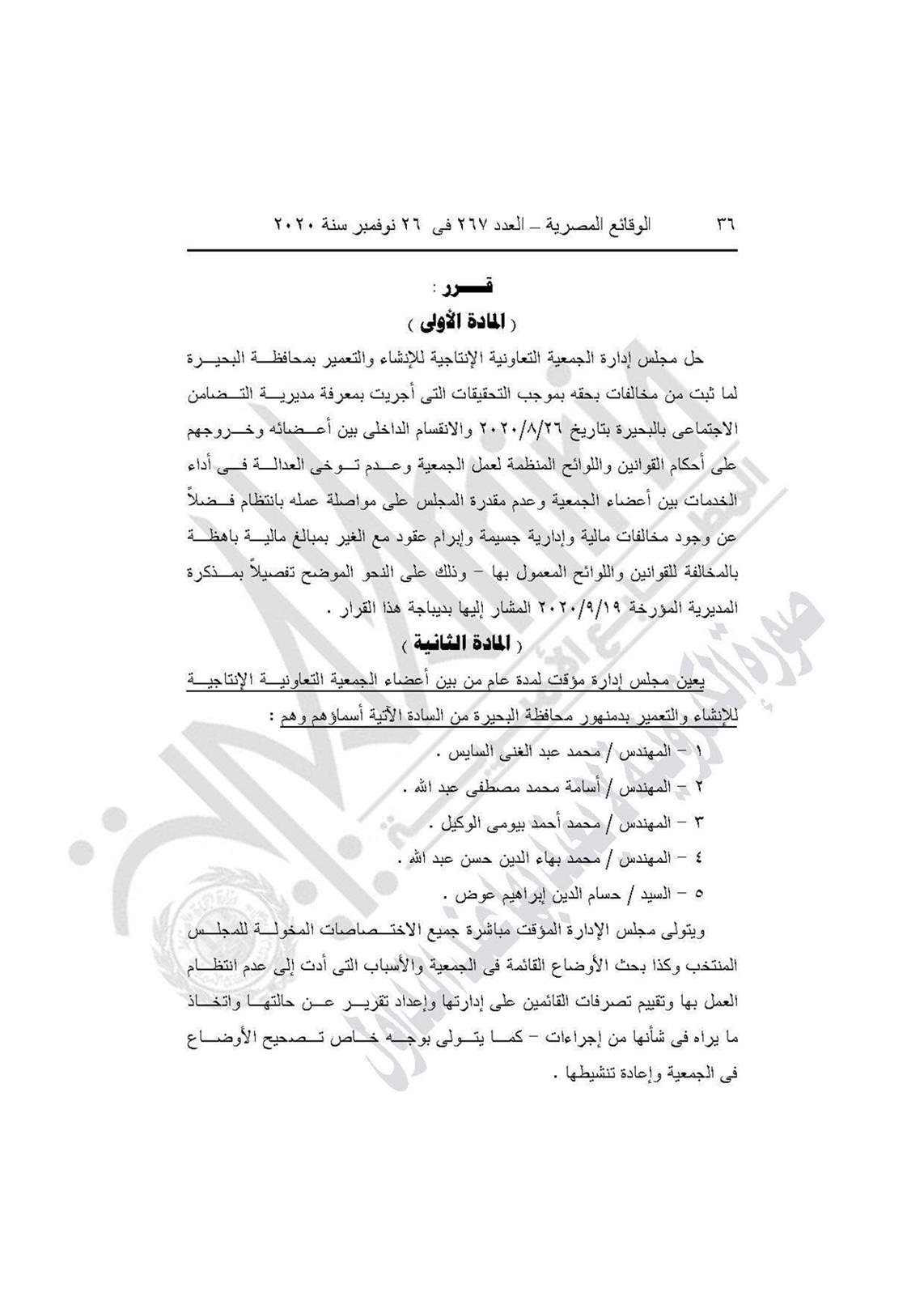 وينص القرارعلى حل مجلس إدارة الجمعية التعاونية الإنتاجية للإنشاء والتعمير بمحافظة البحيرة، بسبب مخالفات ثبتت بحقه بموجب التحقيقات التى أجريت بمعرفة مديرية التضامن الاجتماعى بالبحيرة بتاريخ 26/8/2020، والانقسام الداخلى بين أعضائه وخروجهم على أحكام القوانين واللوائح المنظمة لعمل الجمعية وعدم توخى العدالة فى أداء الخدمات بين أعضاء الجمعية؛ وعدم مقدرة المجلس على مواصلة عمله بانتظام فضلاً عن وجود مخالفات مالية وإدارية جسيمة وإبرام عقود مع الغير بمبالغ مالية باهظة بالمخالفة للقوانين واللوائح المعمول بها، وذلك على النحو الموضح تفصيلاً بمذكرة المديرية المؤرخة 19/9/2020 المشار إليها بديباجة هذا القرار .